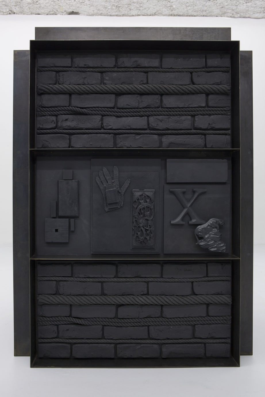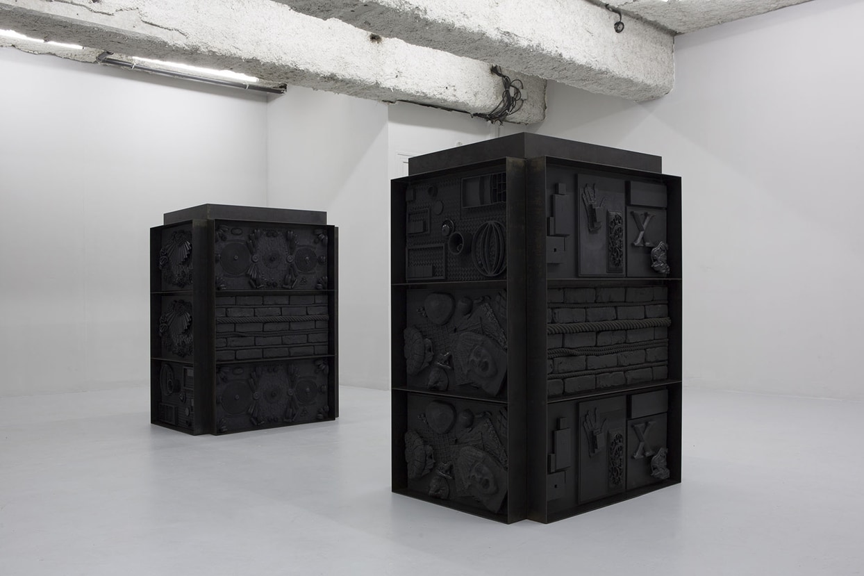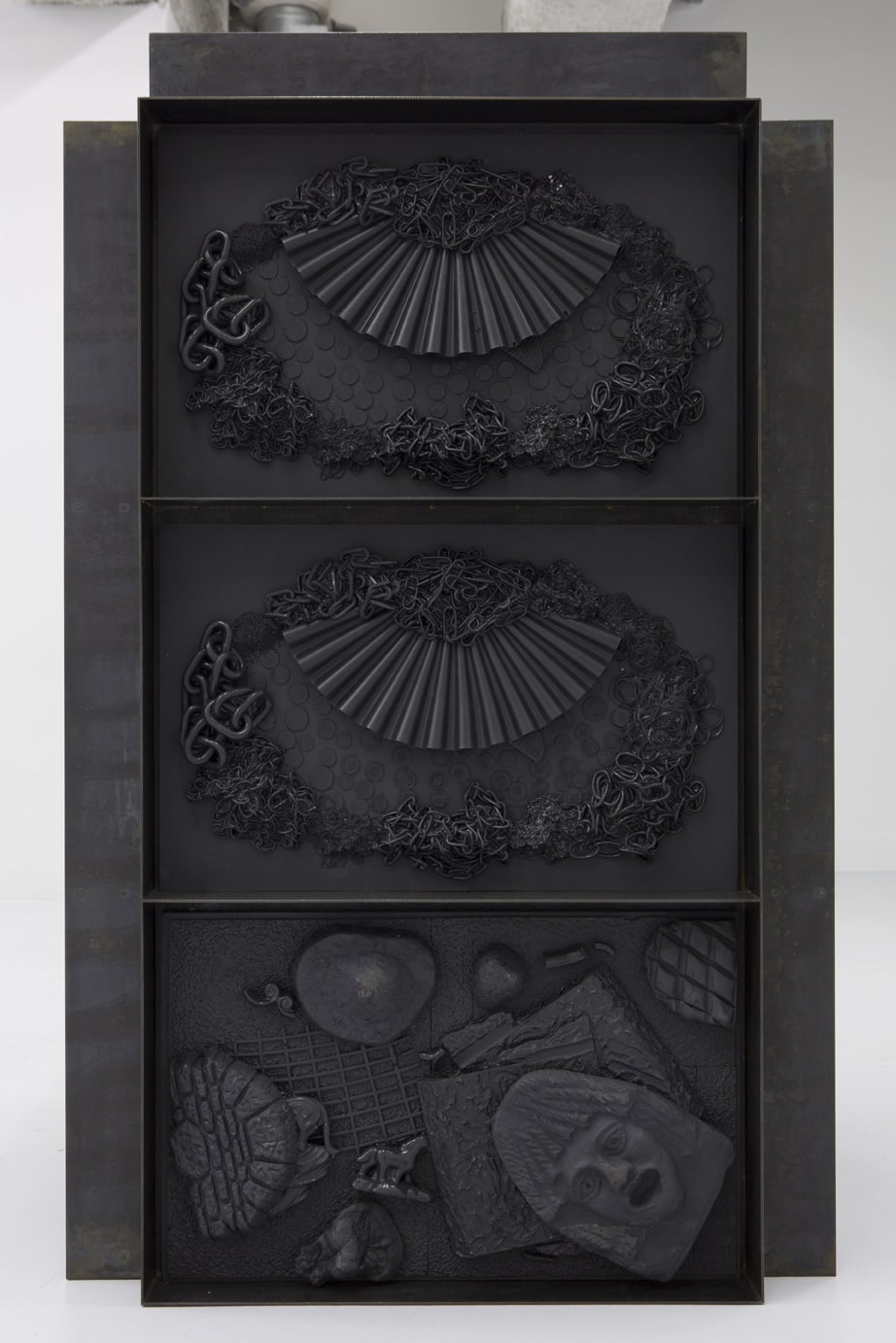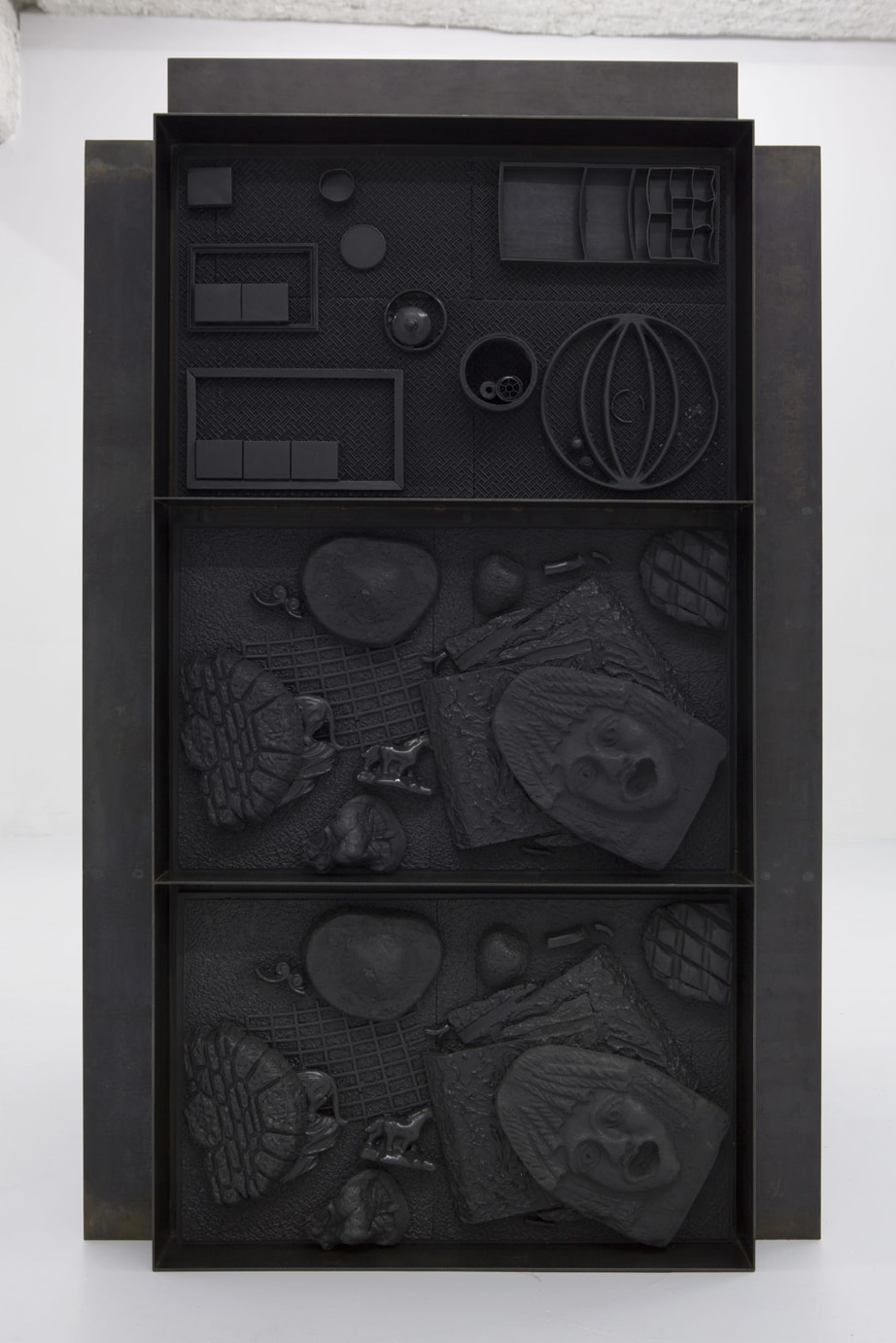 Cette nouvelle série de sculptures, librement inspirée des Concept-tableaux d’Edward Kienholz God Box n. 1, n. 2, n. 3 (1963), consiste en des boîtes fermées de «dimensions proches de celles de l’Accumulateur d’Orgone de Willem Reich» (142 x 106 x 88 cm) et partitionnées de compositions d’objets moulées en élastomère de polyuréthane. Les structures sont en acier teinté et les panneaux, qui peuvent évoquer les bas-reliefs des portes d’églises, indiquent un intérêt pour la production sérielle, la répétition et la différence: il y a sept compositions de trois dimensions différentes, offrant autant de combinatoires possibles.