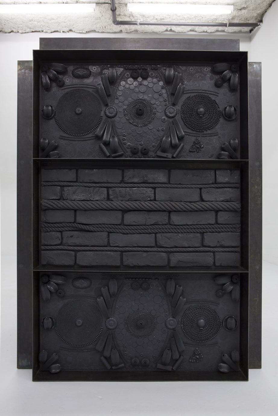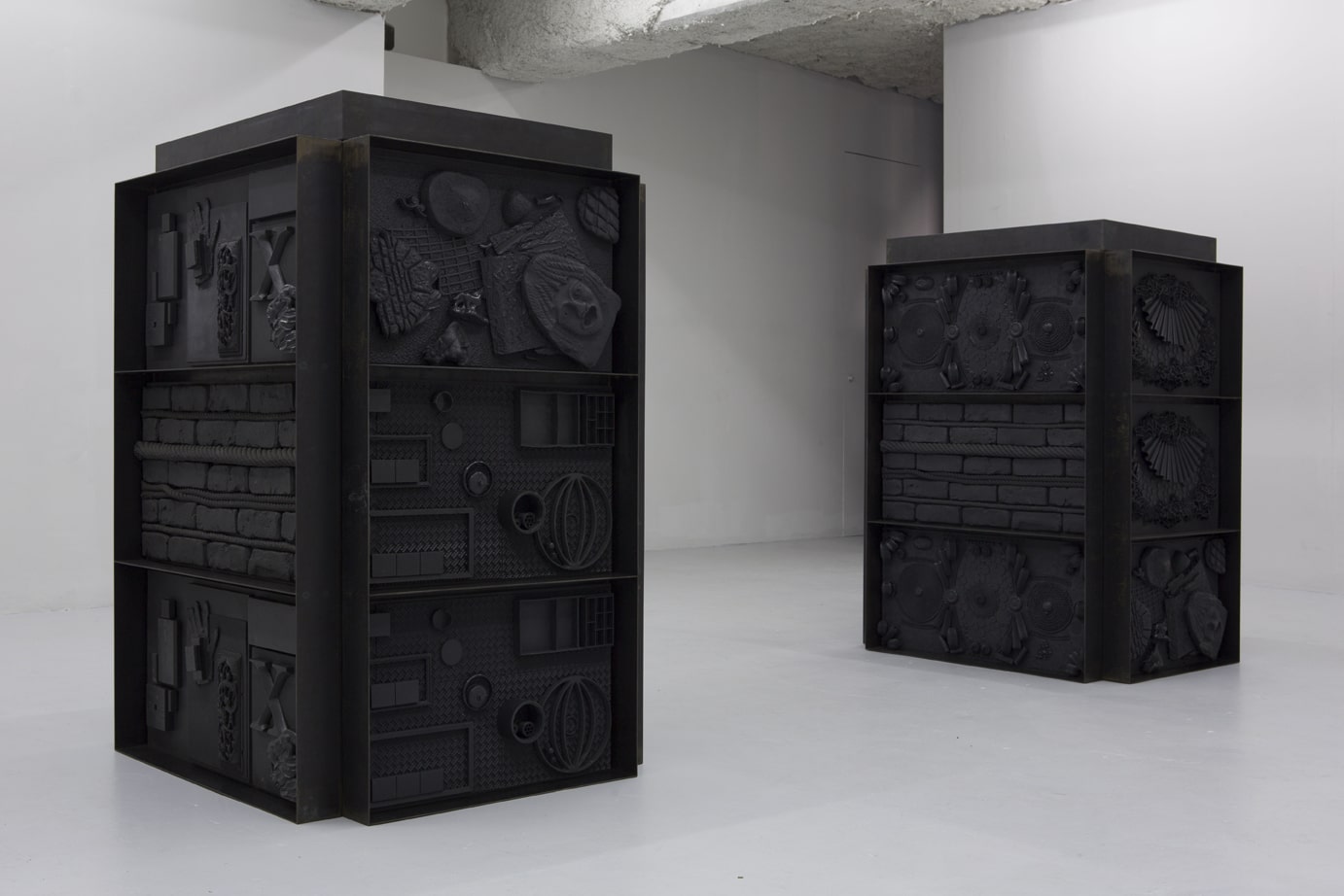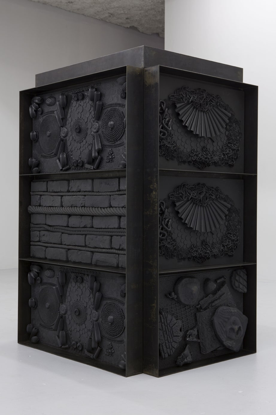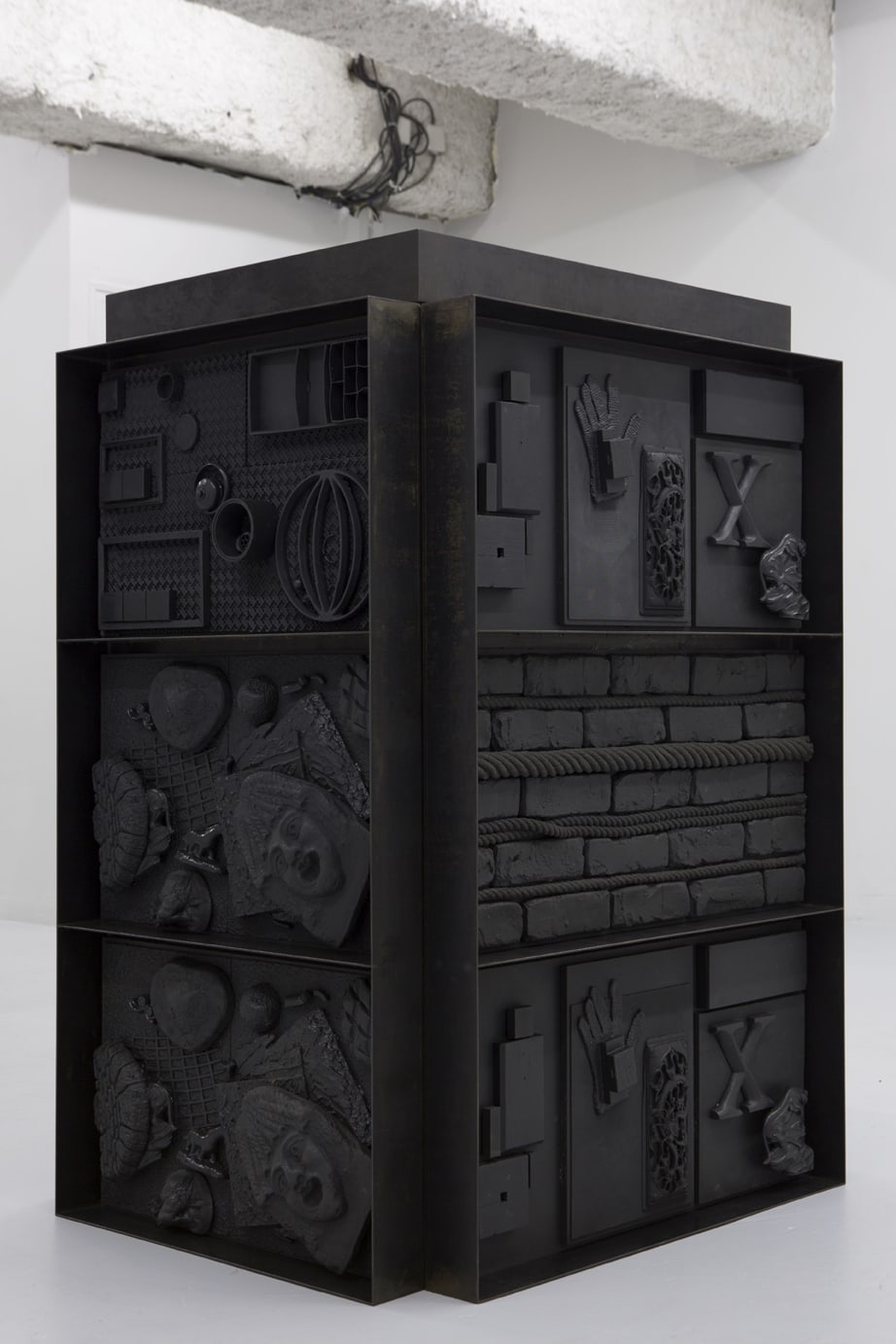 Cette nouvelle série de sculptures, librement inspirée des Concept-tableaux d’Edward Kienholz God Box n. 1, n. 2, n. 3 (1963), consiste en des boîtes fermées de «dimensions proches de celles de l’Accumulateur d’Orgone de Willem Reich» (142 x 106 x 88 cm) et partitionnées de compositions d’objets moulées en élastomère de polyuréthane. Les structures sont en acier teinté et les panneaux, qui peuvent évoquer les bas-reliefs des portes d’églises, indiquent un intérêt pour la production sérielle, la répétition et la différence: il y a sept compositions de trois dimensions différentes, offrant autant de combinatoires possibles.
