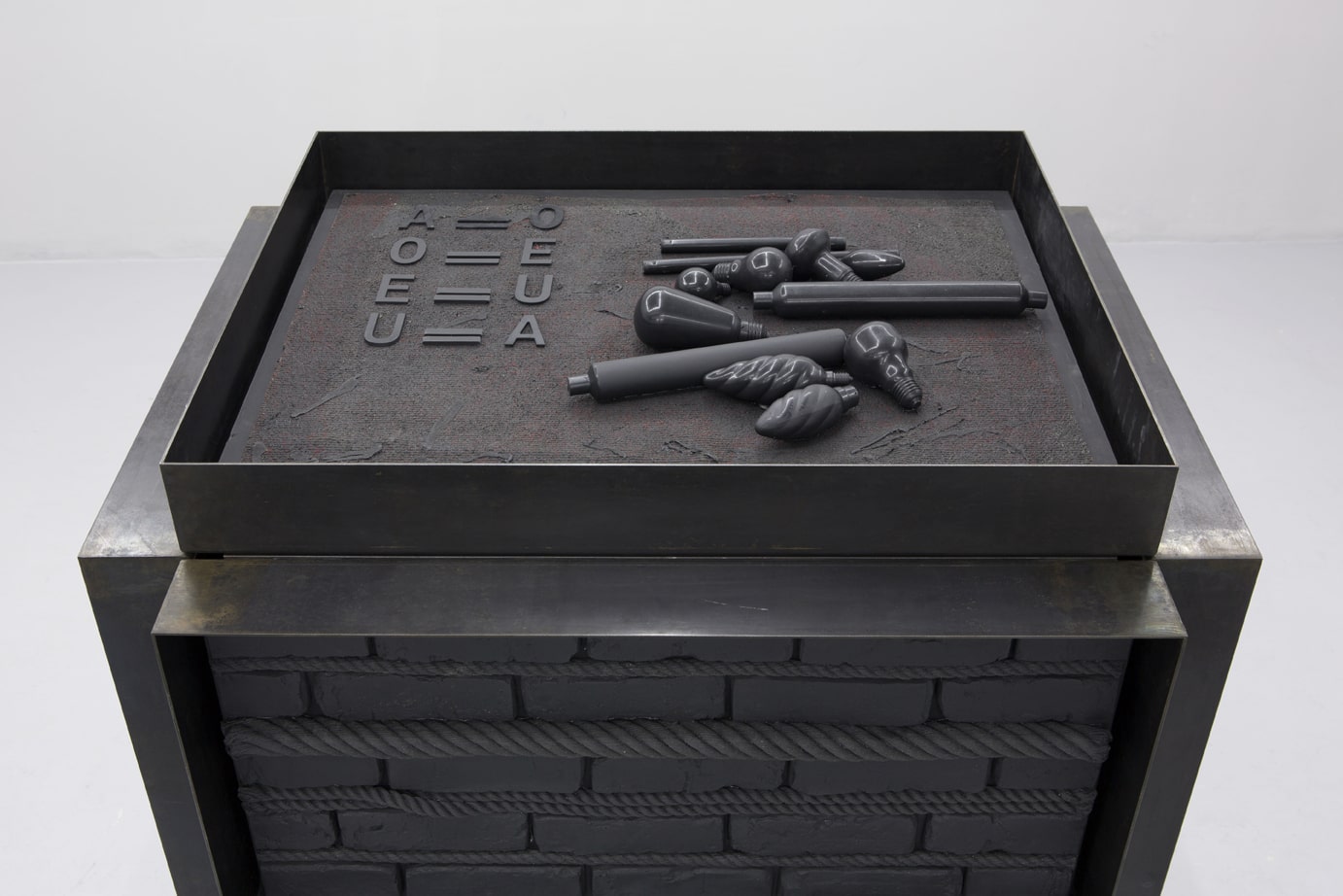 QL: Speaking of trips, I’ve often “read” your horizontal cast works—the “Homonymes”, for example—as something akin to hieroglyphics. They seemed like an attempt to make sense of objects via a type of logographic writing system. What is the relationship to language in your new “God Boxes”? How have ideas of language manifested themselves in your larger body of work or been integral to your thinking about it?