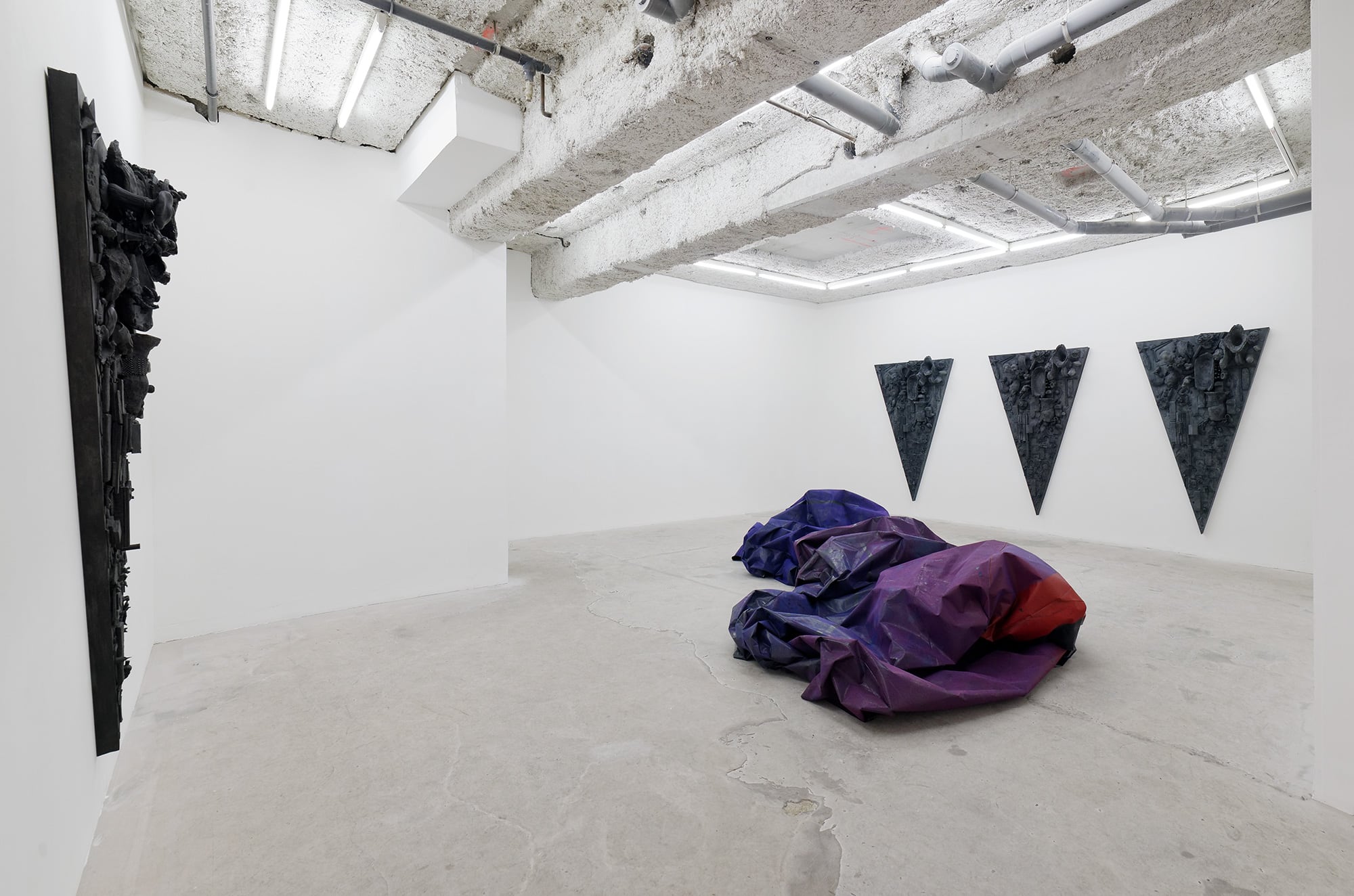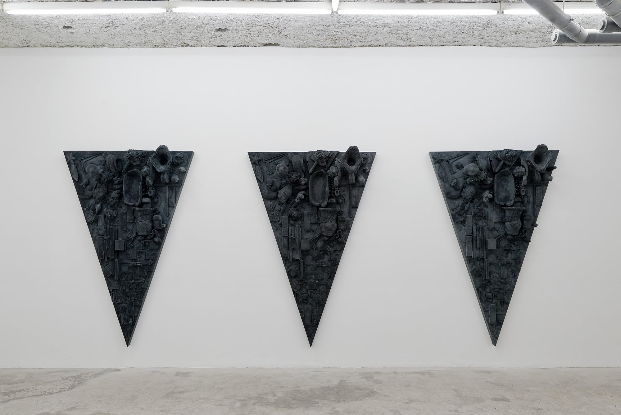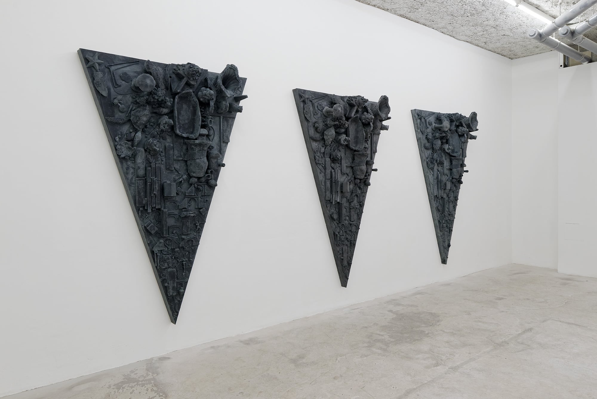 The five reliefs that provide a major focal point in this exhibition are the latest in an ongoing series of works, entitled Homonymes, in which Cornaro uses various materials (here Acrystal, a type of Hydrocal cement) to cast accumulations of pre-existing objects as a single form. Unlike previous Homonyme reliefs the new examples are characterized by their overall triangular shape, which lends them a sharply identifiable silhouette when viewed from afar. They deliver an altogether different emotional charge, however, as the viewer approaches and their basic geometry reveals itself to be an envelope for a cascade of visually and culturally fraught forms that include disembodied fragments of figurines and other statuary; trinkets, coins, jewelry, and bits of decoration; miniature architectural elements; and discarded pieces of material whose original function is unclear.