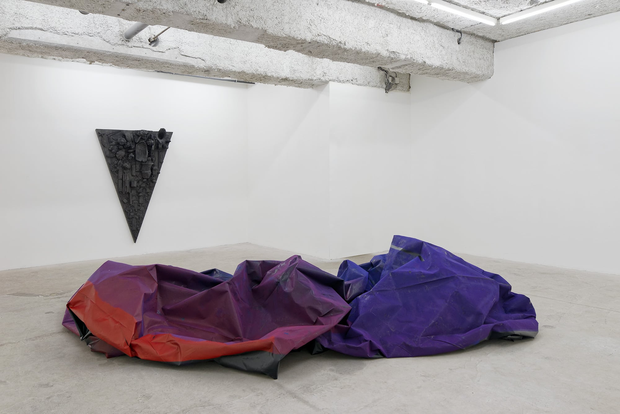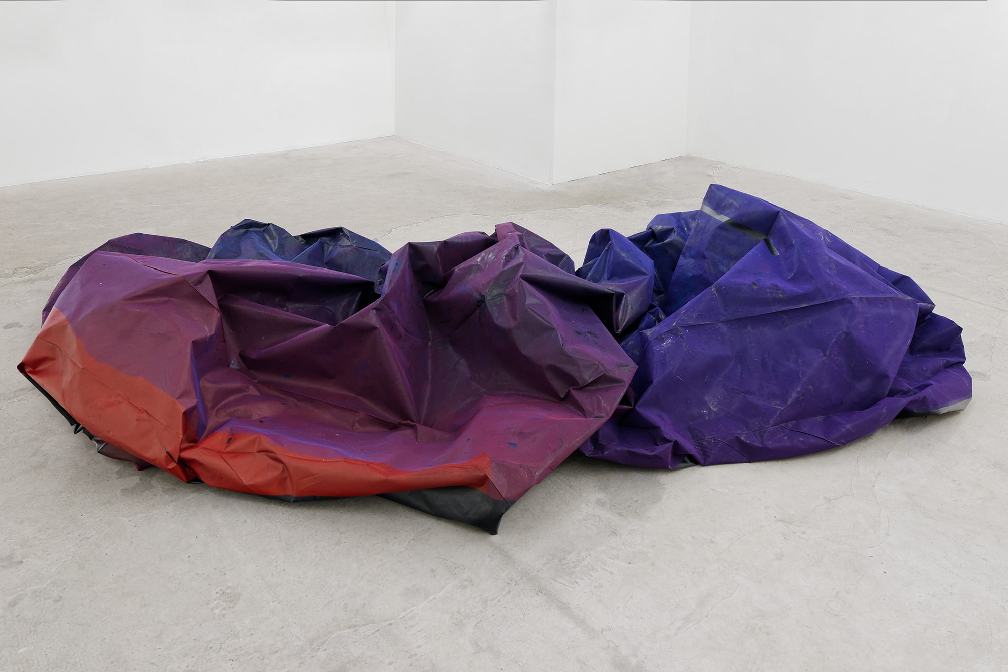 This backdrop of dissolution assumes the spotlight in the floor-based installation that provides the exhibition with its weightless center of gravity. Consisting of folded and creased sheets of plastic covered in luminous, particulate fields of spray-paint, the work is provocatively shapeless, an exercise in anti-form. Since the plastic is a kind of film, Cornaro’s moving image work once again comes to mind, but it is in fact a byproduct from the making of wall paintings, yet another facet of her practice: the plastic sheets are originally used to mask off and protect sections of the exhibition spaces in which these site-specific works are installed. An inadvertent, aleatory composition is created when paint that exceeds the intended limits of the wall painting lands on the plastic, which in turn provides a record of what was not intended to be included in the work itself. By repurposing the plastic here, Cornaro grants new life to the remains of a process whose first iteration has ended, reminding us that objects often express their purposes only after they have been cast aside.