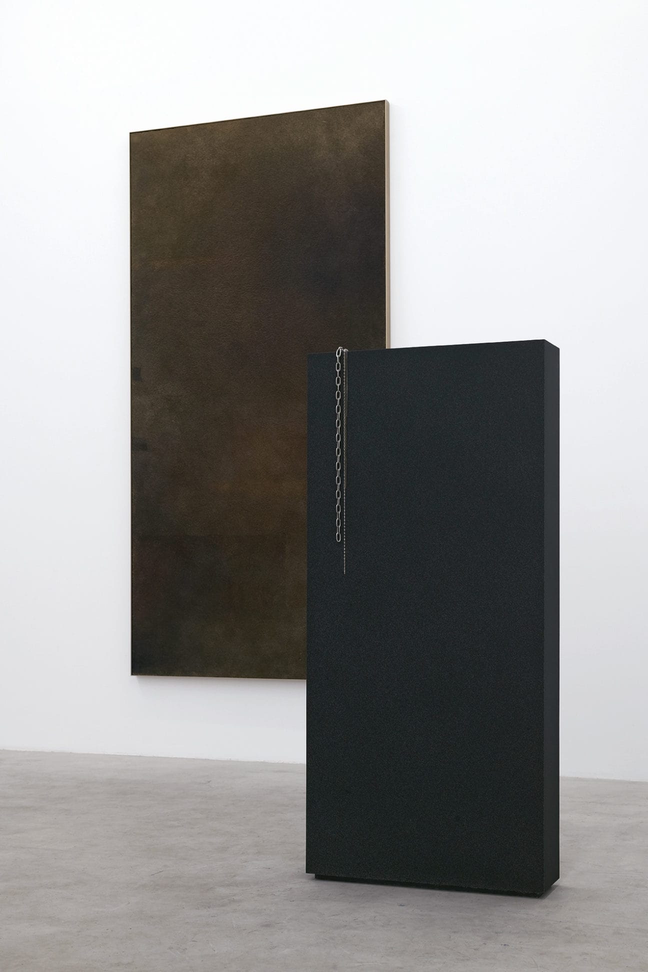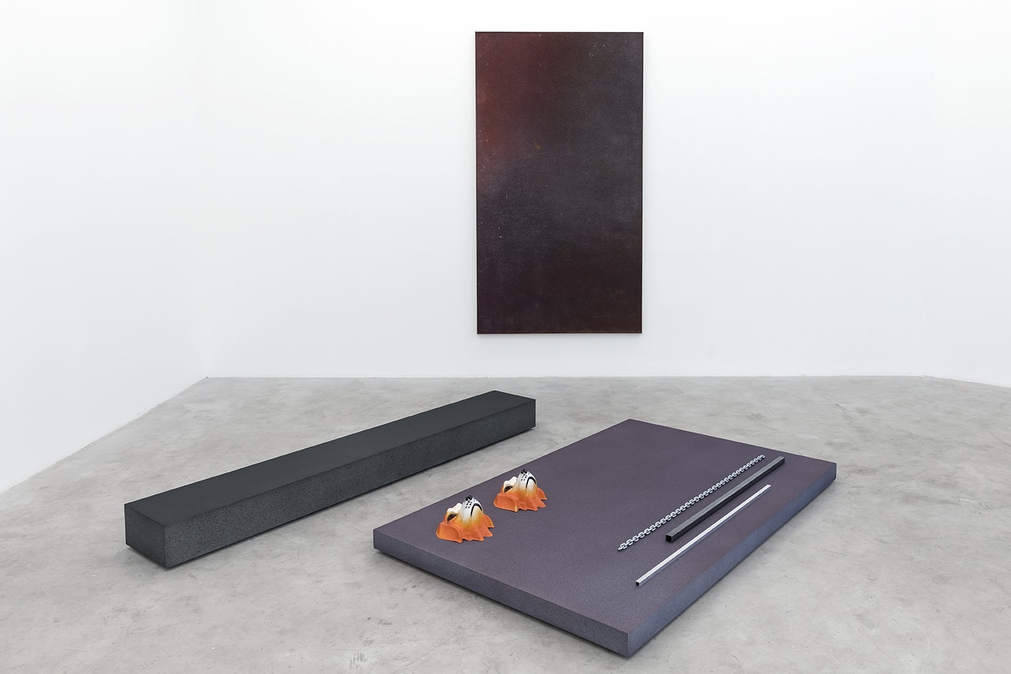 Color has always been important in Cornaro’s work, but perhaps now even more. In preparing this show, she thought about “color anamorphosis” and the impact a change of viewpoint can have on the intensity of a color, and thus the legible identity of a material or object. Twilight has a radical effect on perceptions of color, shape and distance, that fleeting moment before everything goes black. Meanwhile, painted in the bruised palette of menacing clouds, the forms of the artist’s plinths are emphatically minimal. Newly separate, they are no longer displayed clinging together in groups, once evocative of the stage or landscape, but as austere, autonomous forms.