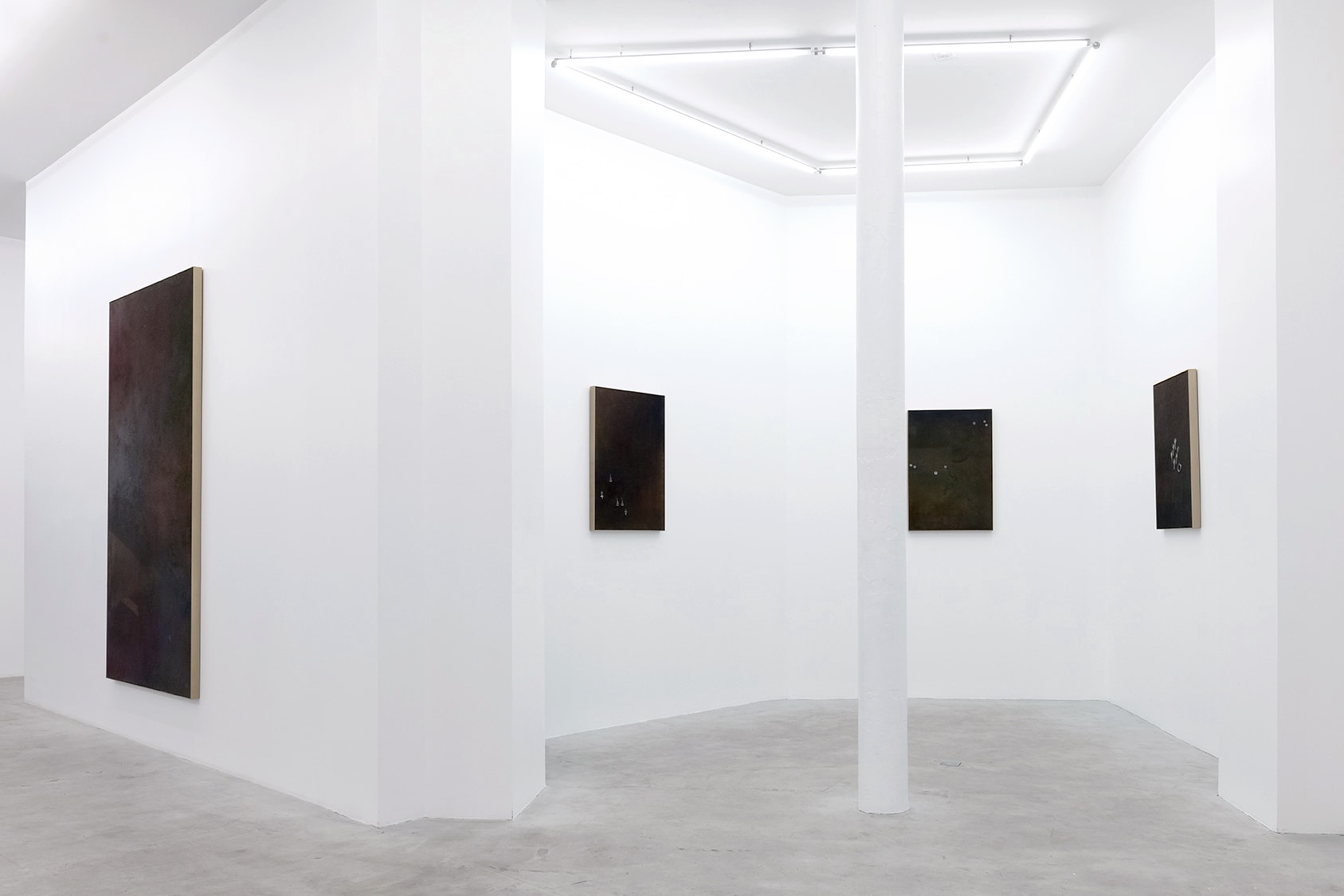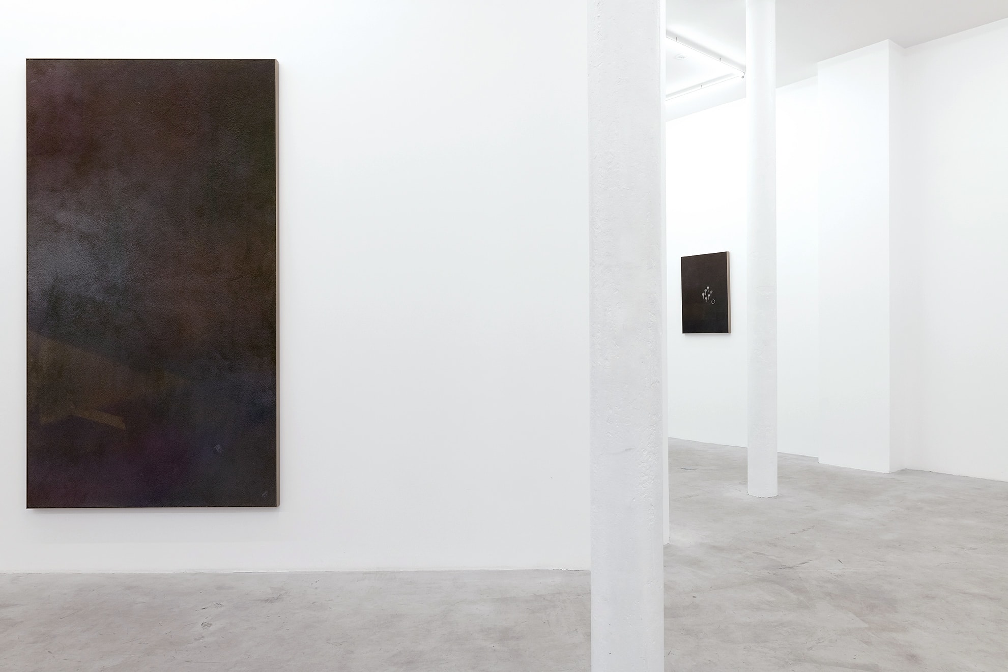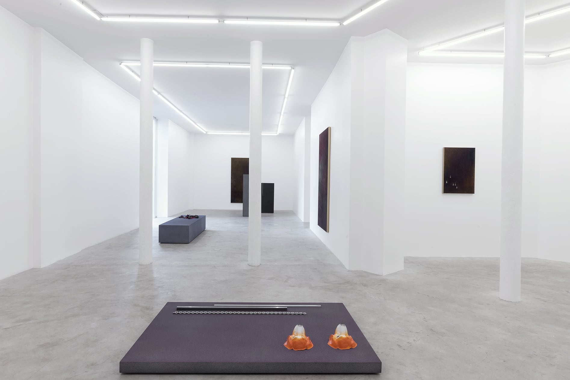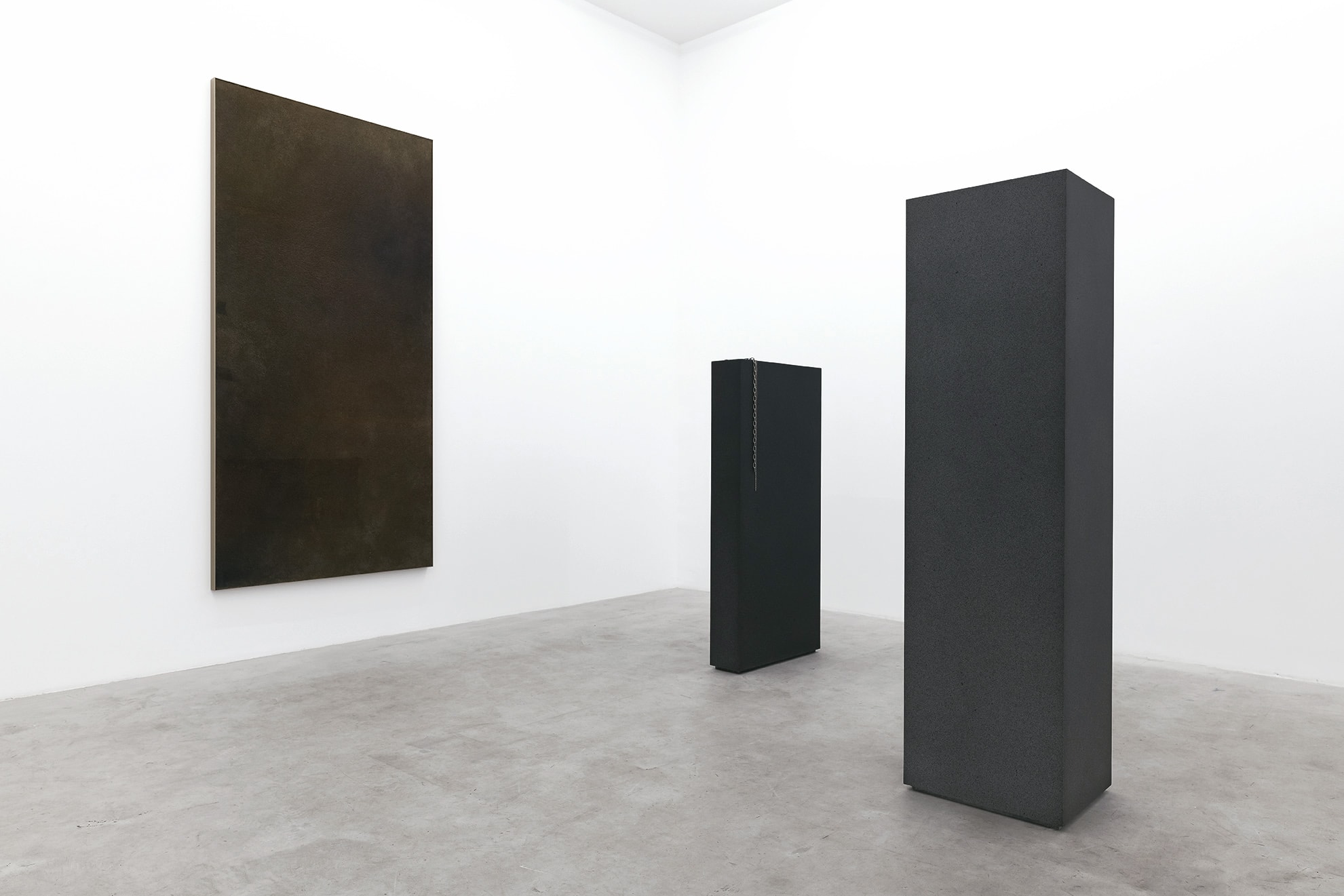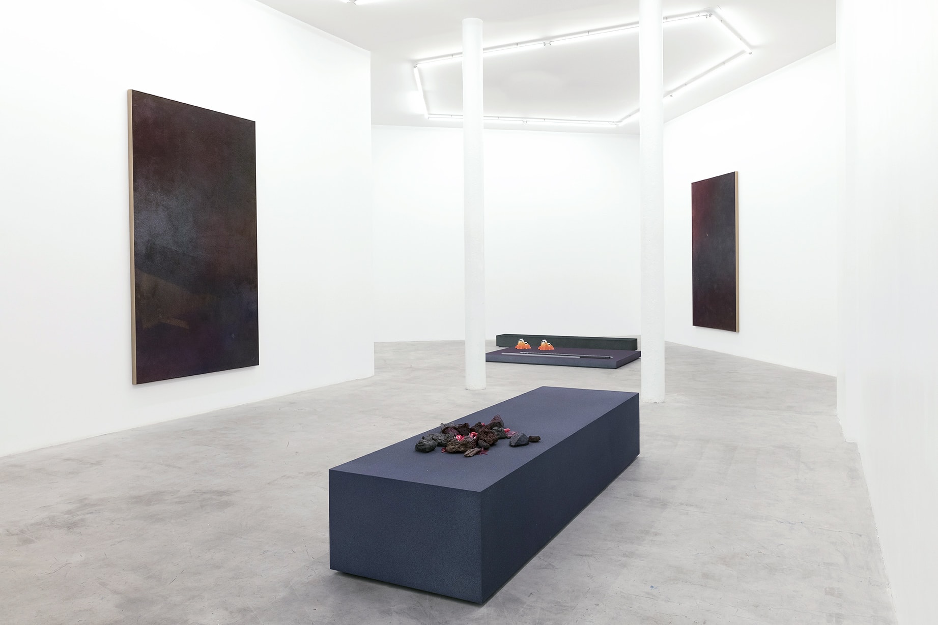 La couleur a toujours tenu une place importante dans le travail de Cornaro, mais peut-être encore davantage dans le cas présent. En préparation de cette exposition, elle a réfléchi à « l’anamorphose des couleurs » et l’impact qu’un changement de point de vue peut avoir sur leur intensité, et ainsi sur l’identité perceptible d’un matériau ou d’un objet. Le crépuscule a un effet radical sur la perception des couleurs, des formes et des distances; ce moment fugace avant que tout ne devienne noir. Peintes dans les tons contusionnés de nuages menaçants, et maintenant présentés sous une forme austère et autonome – non plus groupés à la manière d’une scène ou d’un paysage, les sculptures de l’artiste apparaissent d’autant plus minimalistes.