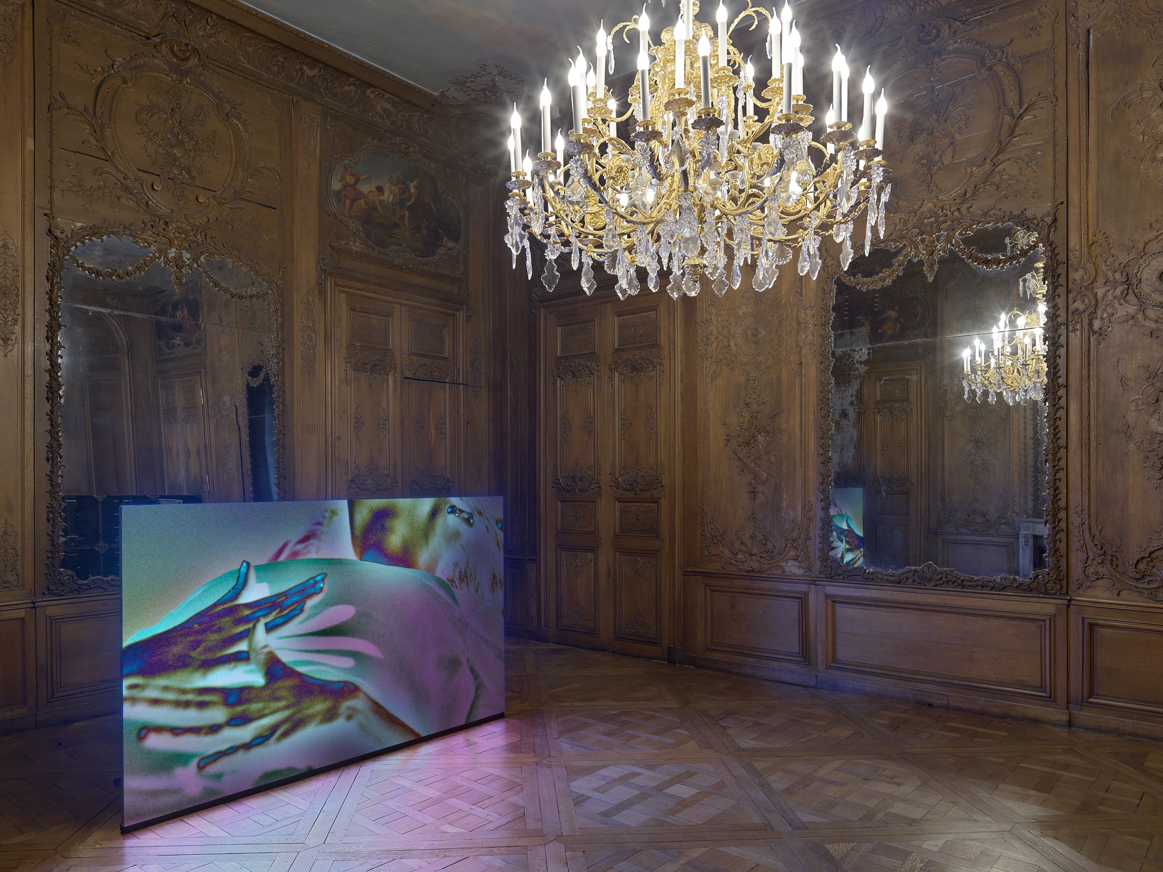 Présentée pour la première fois au château de Rambouillet, Paroxysme est une œuvre filmique incluant des séquences d’images de différentes sources (film 16mm, vidéo, animation) relatives à la guerre, à la religion et à la séduction. Sur un large écran LED disposé dans le cabinet du Président de l’appartement d’Assemblée, ces images sont diffusées dans un montage aléatoire commandé par un algorithme, suivant des données propres au lieu d’exposition (date de construction, coordonnées géographiques).