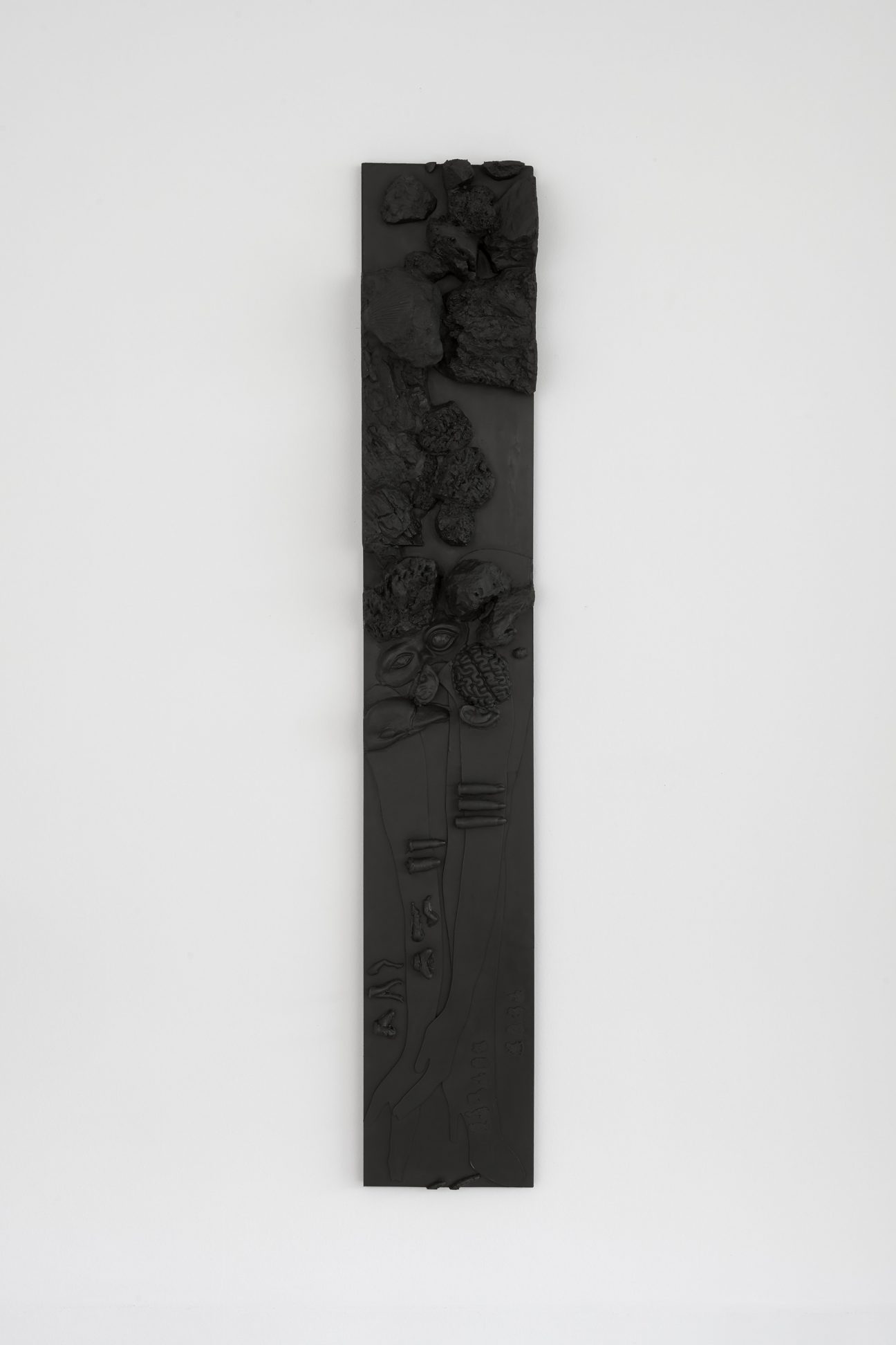Isabelle Cornaro The idea was to put something together without order—as a heap, something informe, or as a set of accumulated objects of a similar typology. You may notice the objects share the shape of a flower, an animal, etc. and that the objects in bas-relief posses stylized patterns, such as laces, decorated metal, ceramic qualities and so on. Along with the geometric shapes found in the other objects, I named them generally under the categories of naturalism, stylization and abstraction, each of which stood for different ways of interpreting a natural model. To put it another way, I wanted to register different grades of resemblance, in that sense, the casted objects are submitted to a double system of resemblance in that they resemble the real objects that have been cast and they serve as abstract ideas or categories. As for the chosen shape and using plaster material, it is important to me that the castings are made in one chunk or block so that the form of the objects appear to be the solidification of a liquid. Additionally, in making the Homonyms series, I thought very much about sixteenth-century Mannerist grottos in which characters were designed and cast out of shapeless stone-like backgrounds.