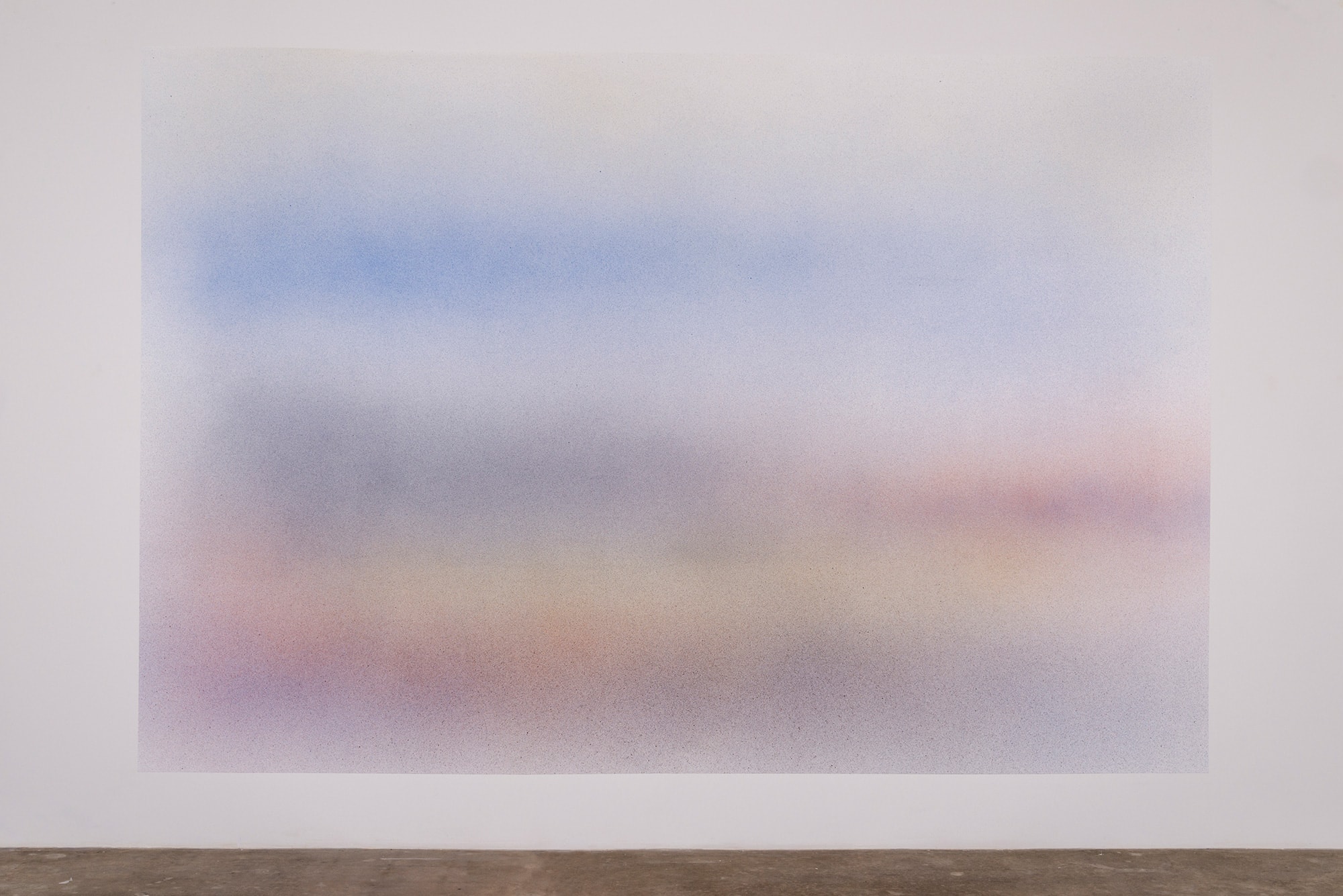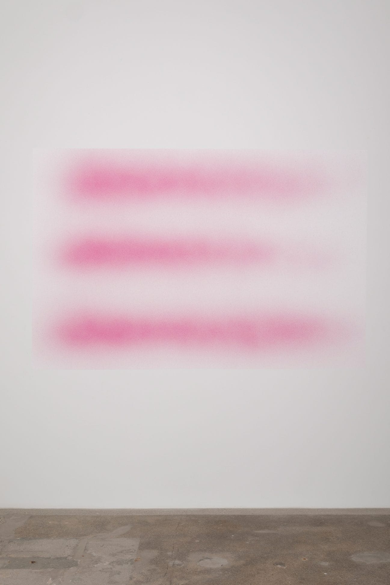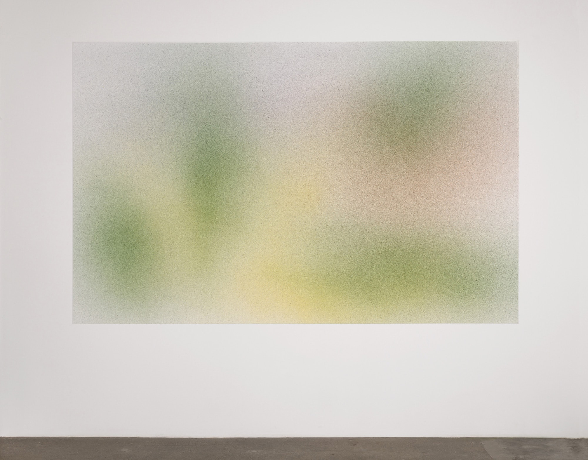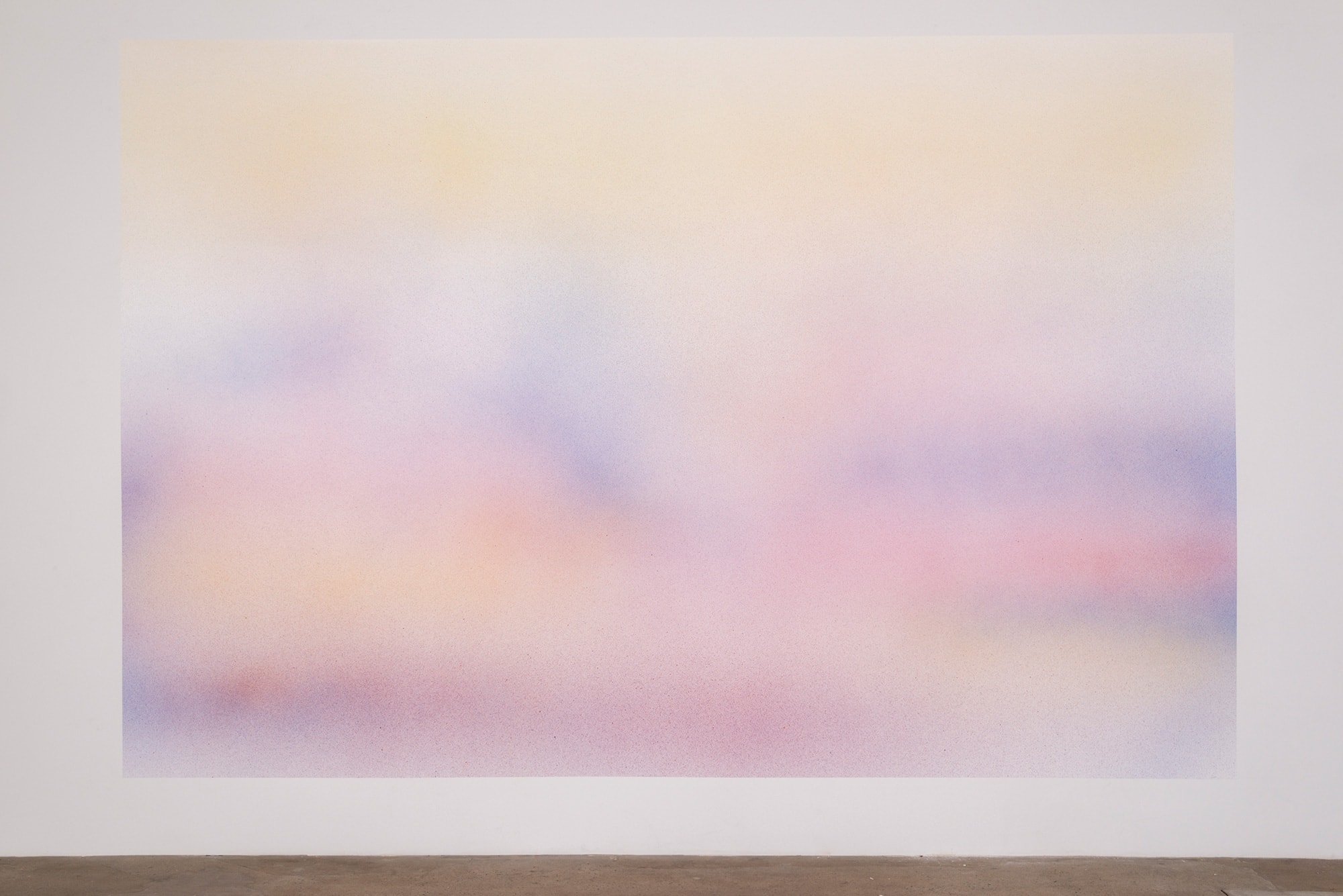 Isabelle Cornaro’s series of 10 wall paintings Reproductions are based on her 16mm movie Floues et Colorées (Hazy and Colorful). In the film Cornaro documents the quick and spontaneous execution of 10 small spray painted works from the viewpoint of the artist. Reproductions are then the enlarged versions of the paintings within the film with variable dimensions that are based on the size of the walls on which the works are realized. Playing with the idea of the autonomy of an artwork, Cornaro’s use of remediation calls attention to the act of painting as an attempt to reproduce something which already exists but in another shape and medium: a film of a painting and a painting of a film.