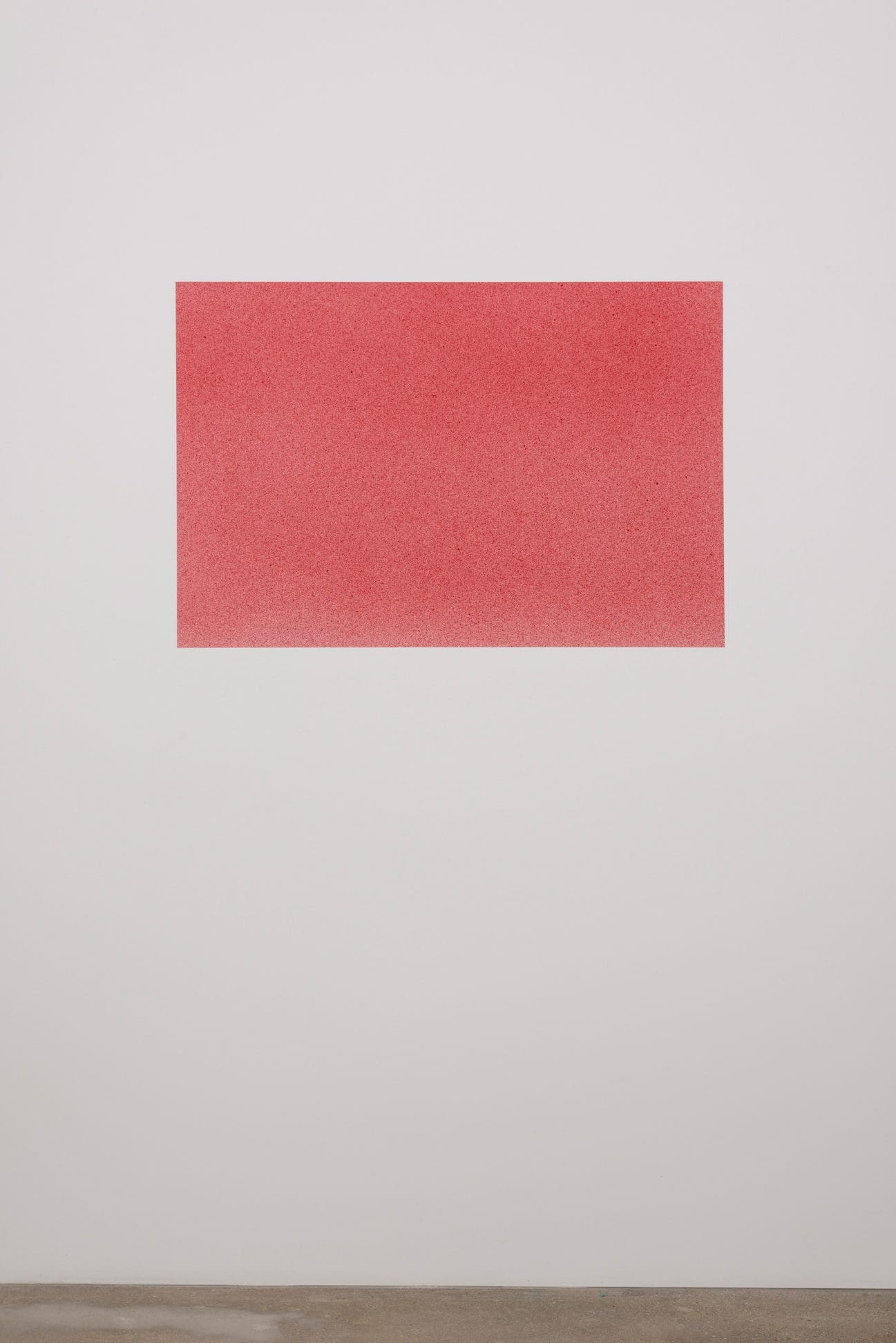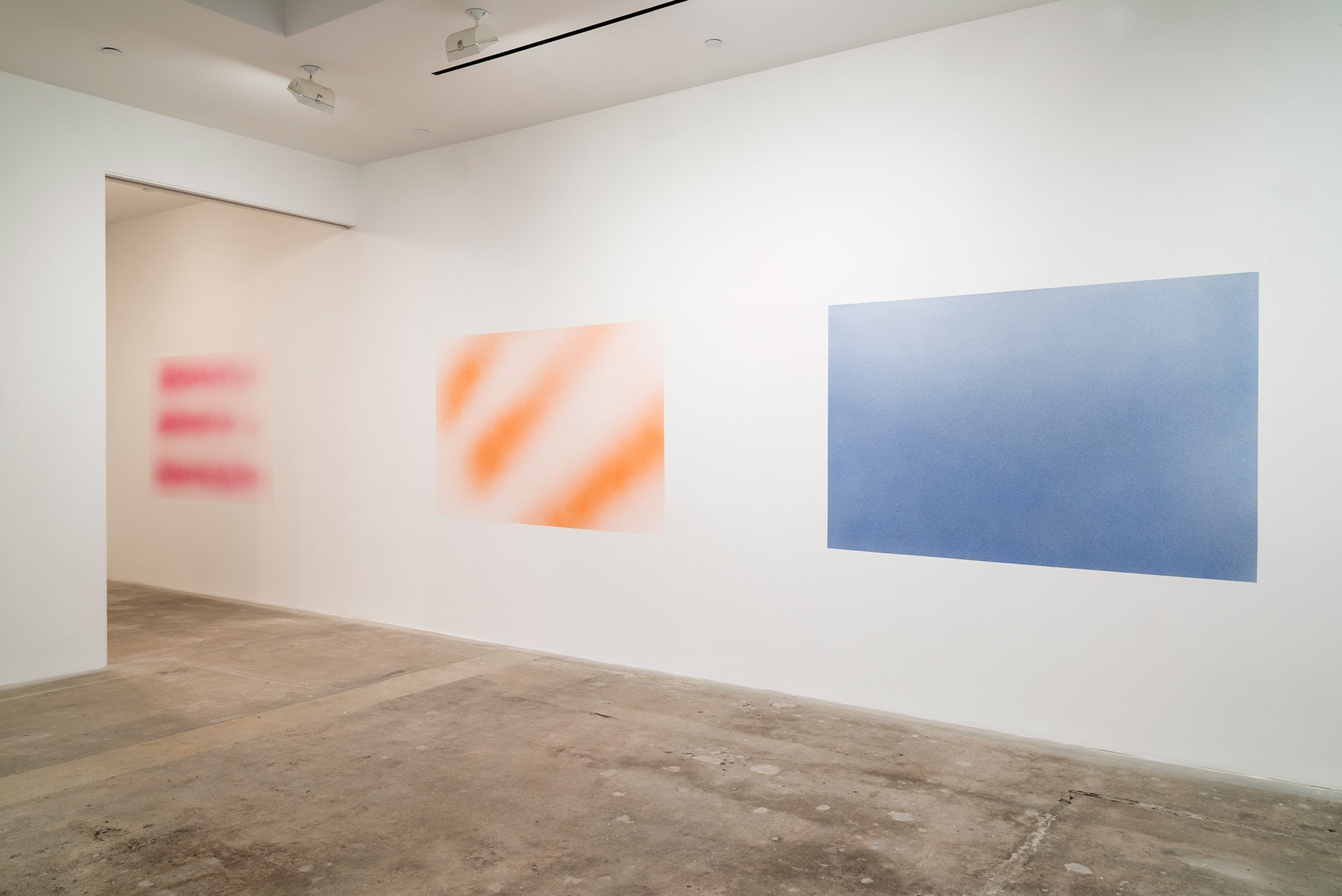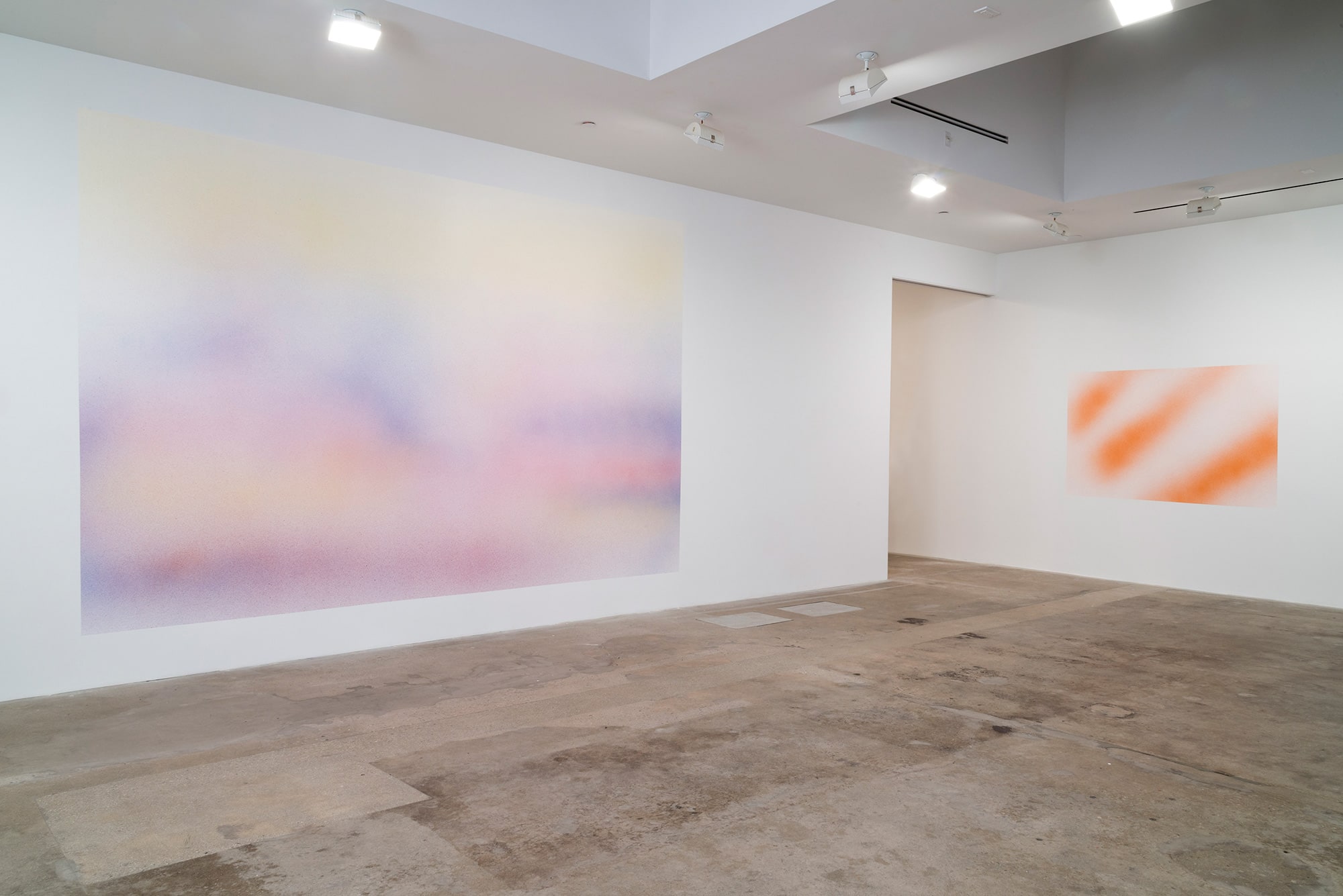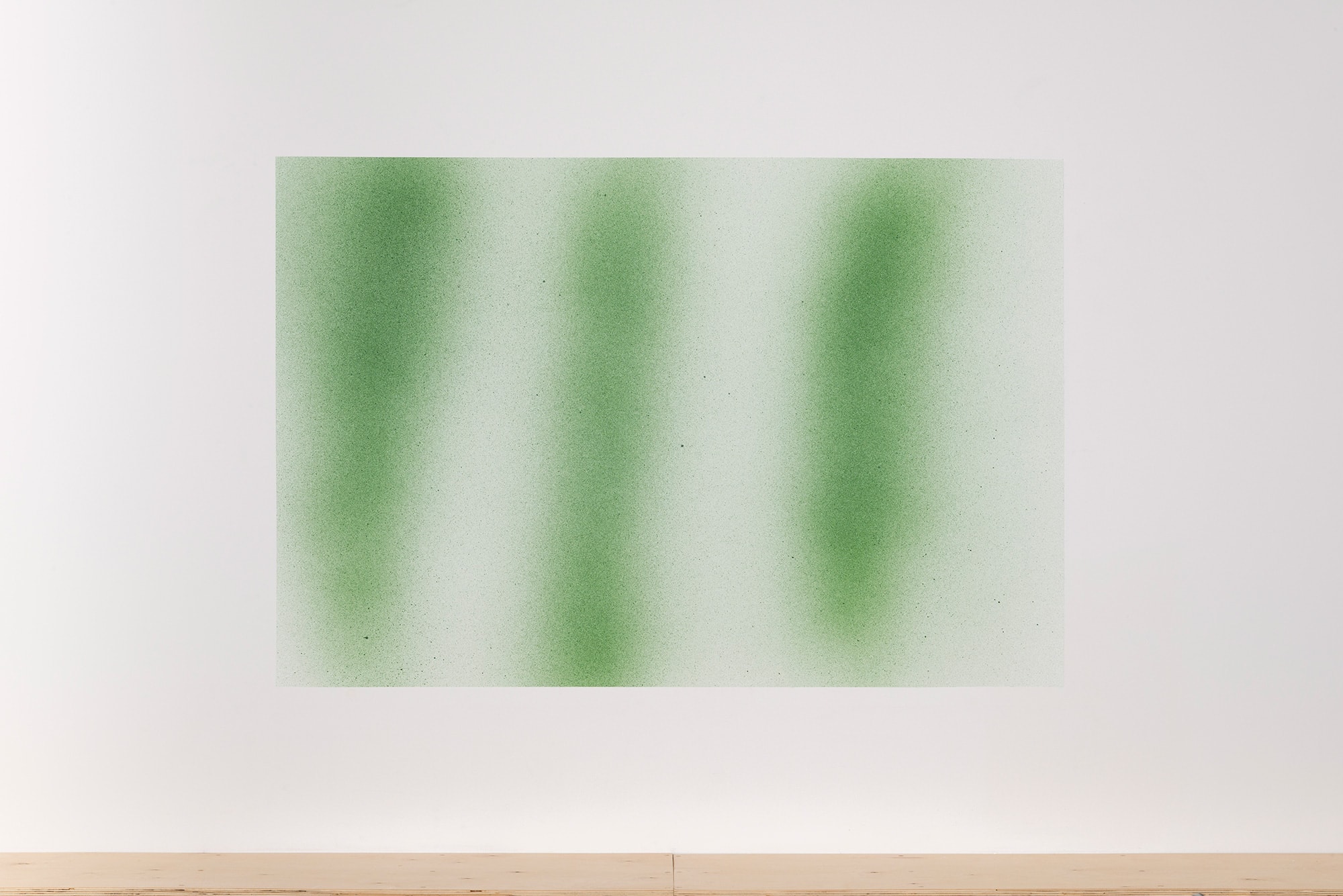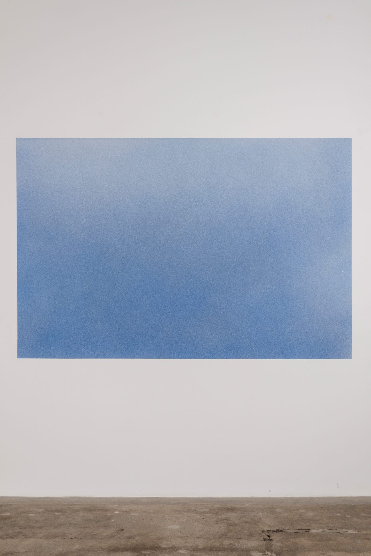Isabelle Cornaro’s series of 10 wall paintings Reproductions are based on her 16mm movie Floues et Colorées (Hazy and Colorful). In the film Cornaro documents the quick and spontaneous execution of 10 small spray painted works from the viewpoint of the artist. Reproductions are then the enlarged versions of the paintings within the film with variable dimensions that are based on the size of the walls on which the works are realized. Playing with the idea of the autonomy of an artwork, Cornaro’s use of remediation calls attention to the act of painting as an attempt to reproduce something which already exists but in another shape and medium: a film of a painting and a painting of a film.