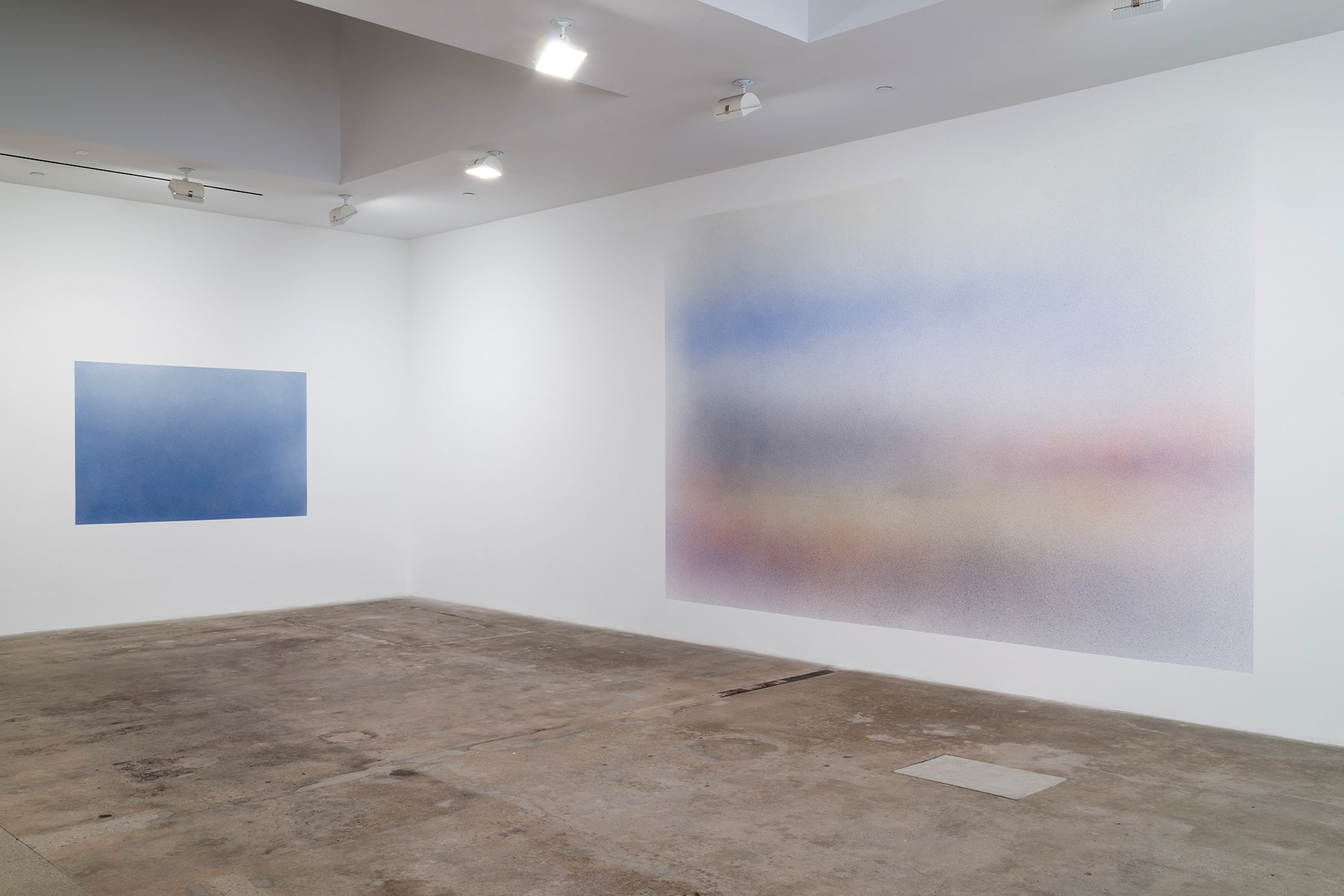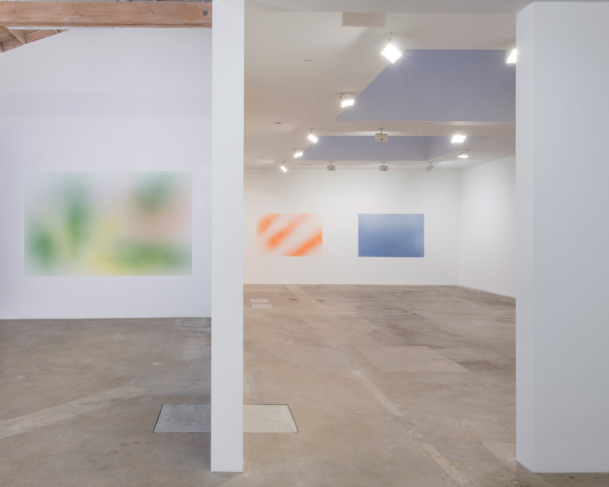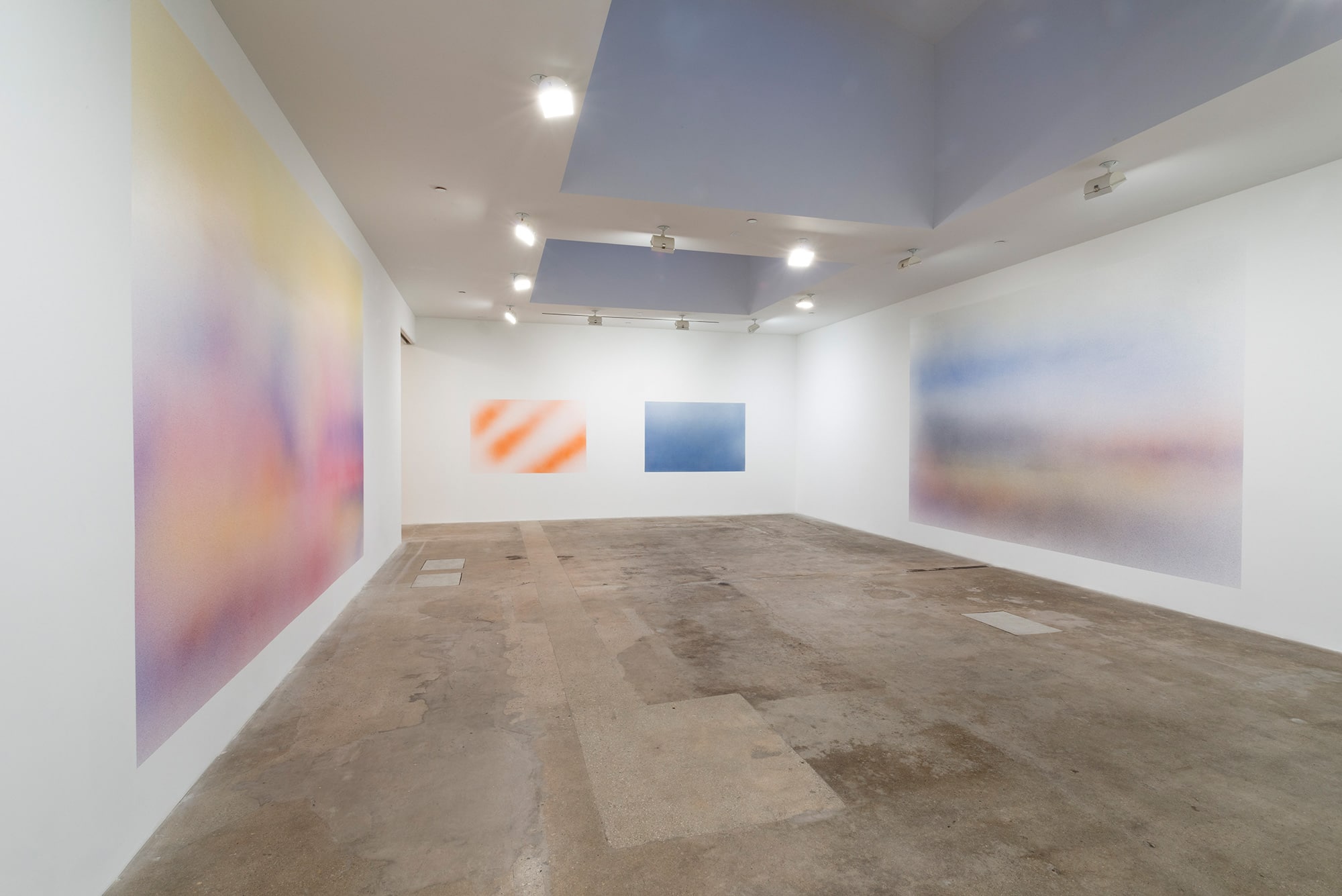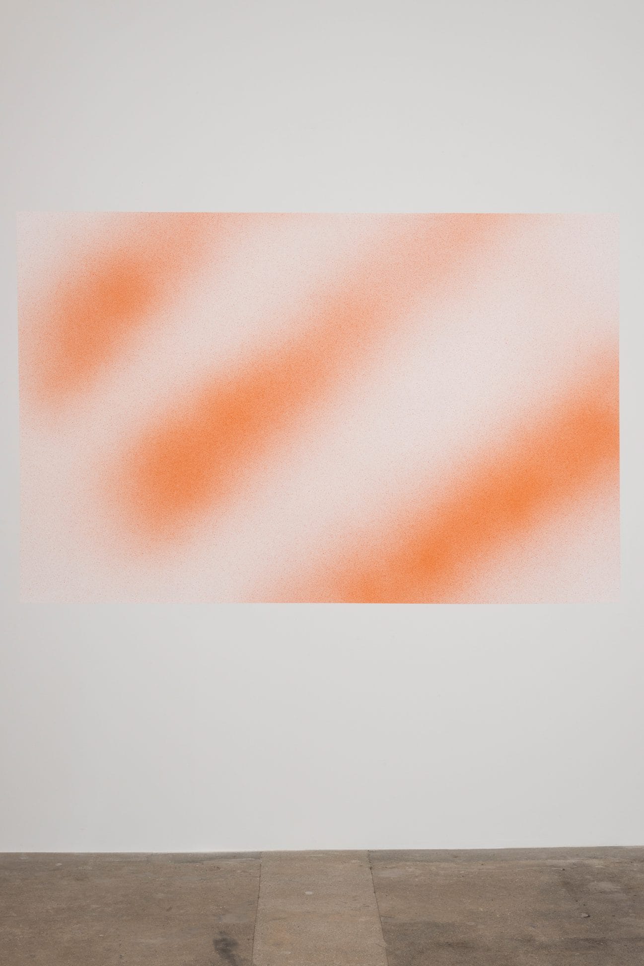 Isabelle Cornaro’s series of 10 wall paintings Reproductions are based on her 16mm movie Floues et Colorées (Hazy and Colorful). In the film Cornaro documents the quick and spontaneous execution of 10 small spray painted works from the viewpoint of the artist. Reproductions are then the enlarged versions of the paintings within the film with variable dimensions that are based on the size of the walls on which the works are realized. Playing with the idea of the autonomy of an artwork, Cornaro’s use of remediation calls attention to the act of painting as an attempt to reproduce something which already exists but in another shape and medium: a film of a painting and a painting of a film.