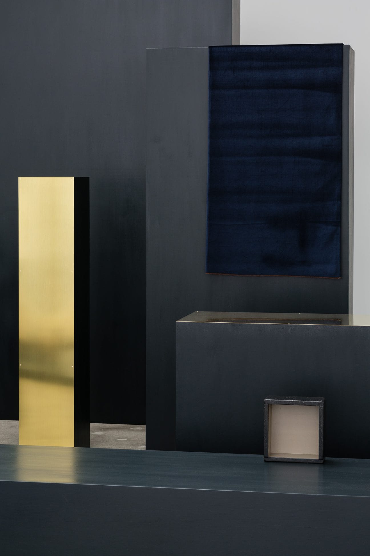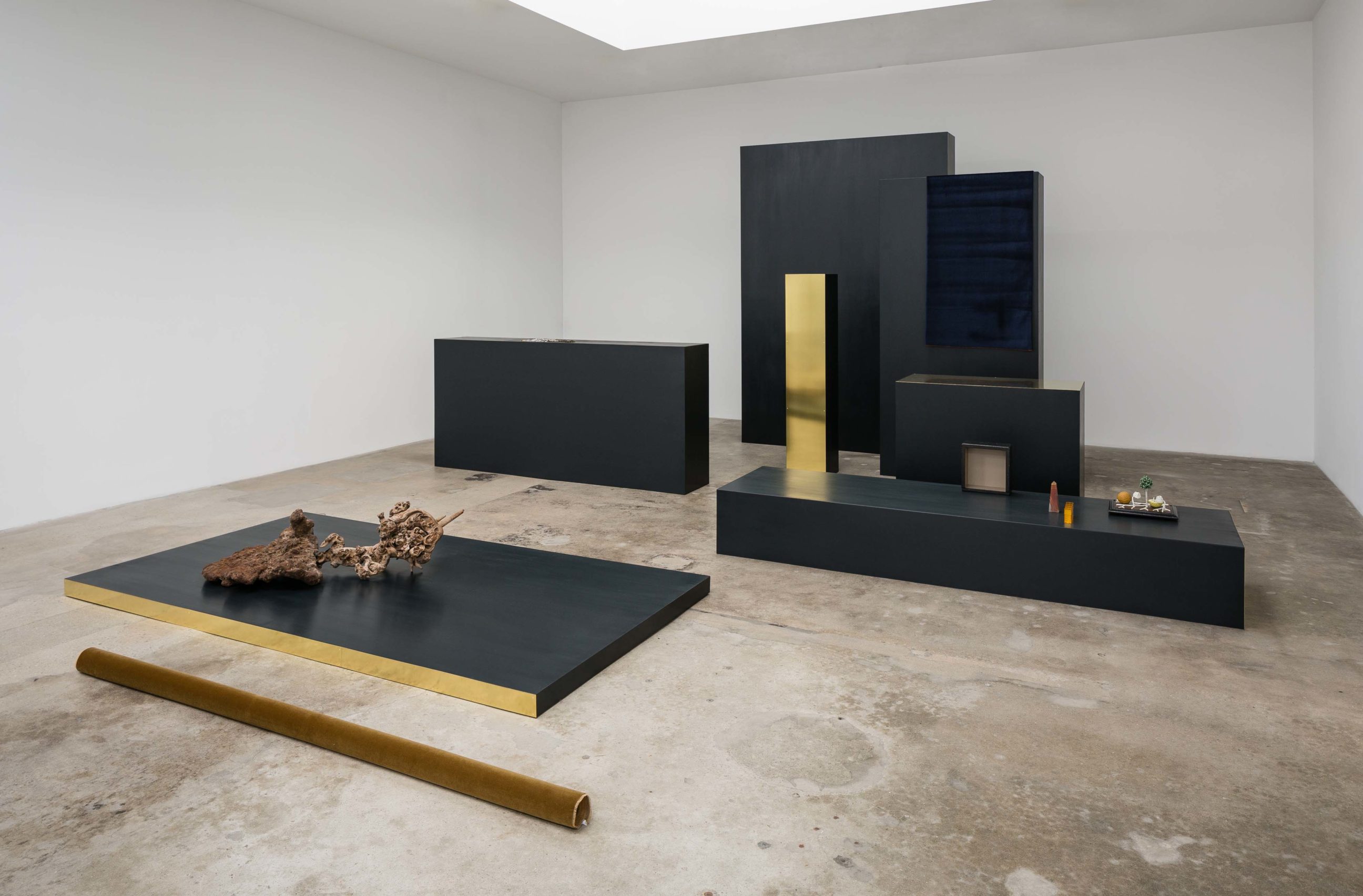 At the focal point of the exhibition, Cornaro has installed a large-scale composition of stands and display elements, interspersed with an array of found objects and cylindrical rolls of velvet fabric. Reminiscent of a classical landscape painting translated into volumes, planes, and perspective markers, the work reveals itself as a static “tableau,” an abstraction of reality, which fragments away as the viewer’s movements through the installation breaks the spatial organization. The objects within the installation are either ornamental or symbolic, eliciting a narrative of fetishism and exchange value that reverberates throughout all the works in the exhibition.