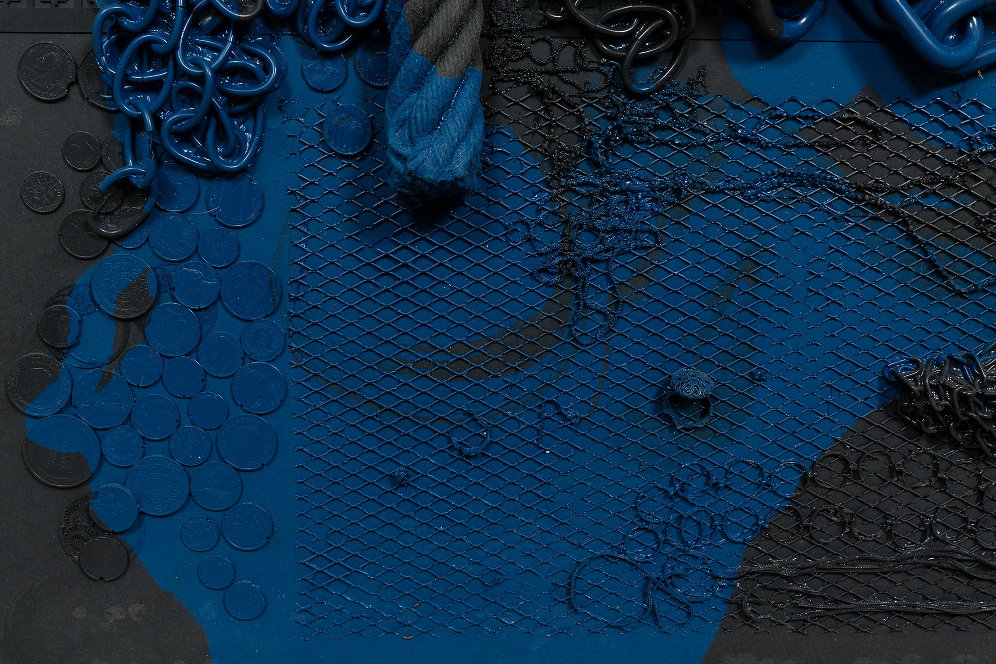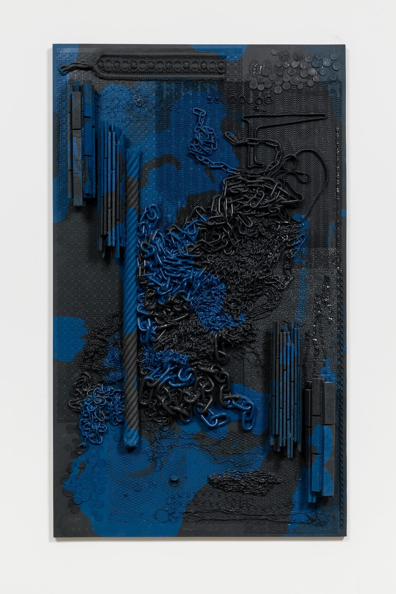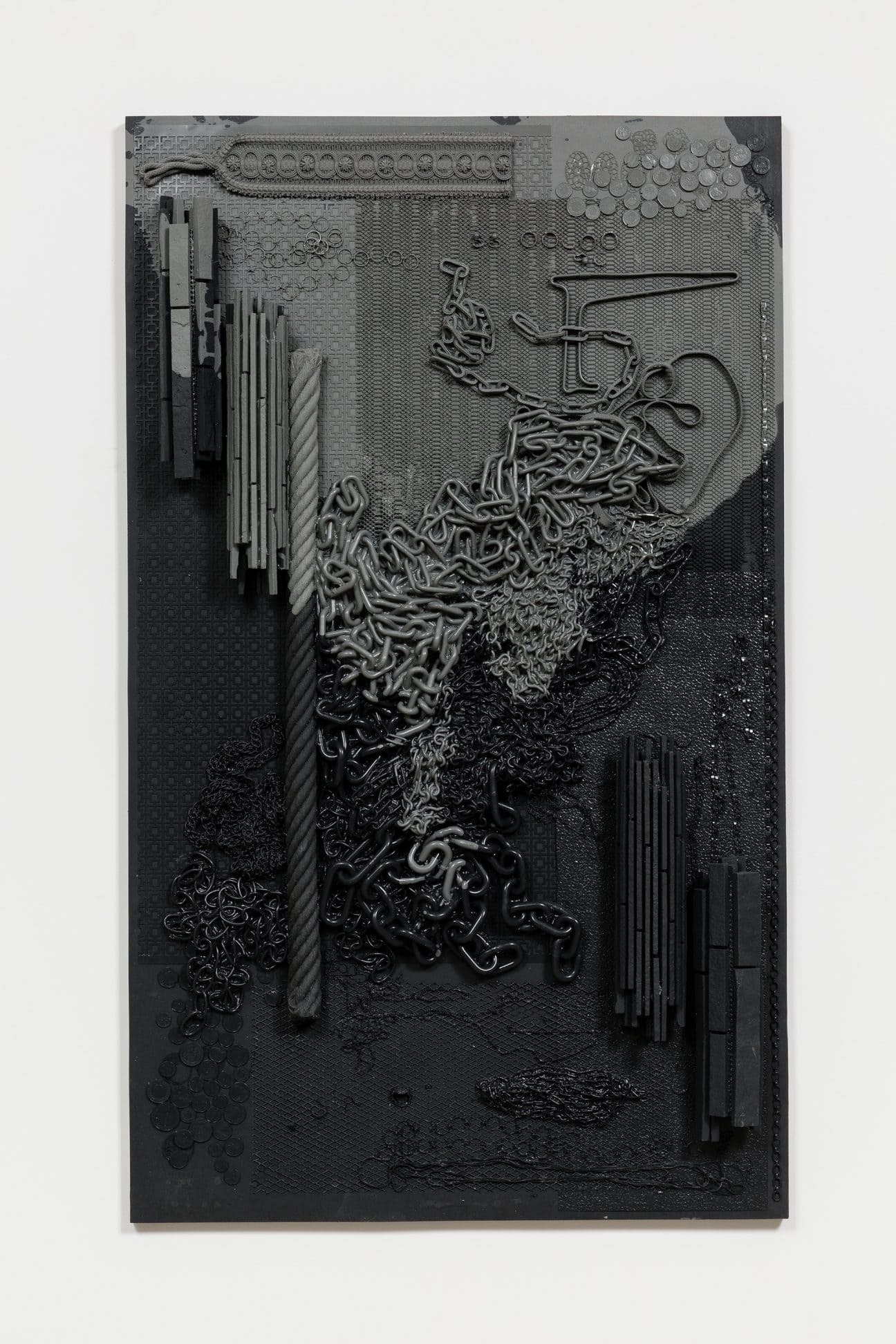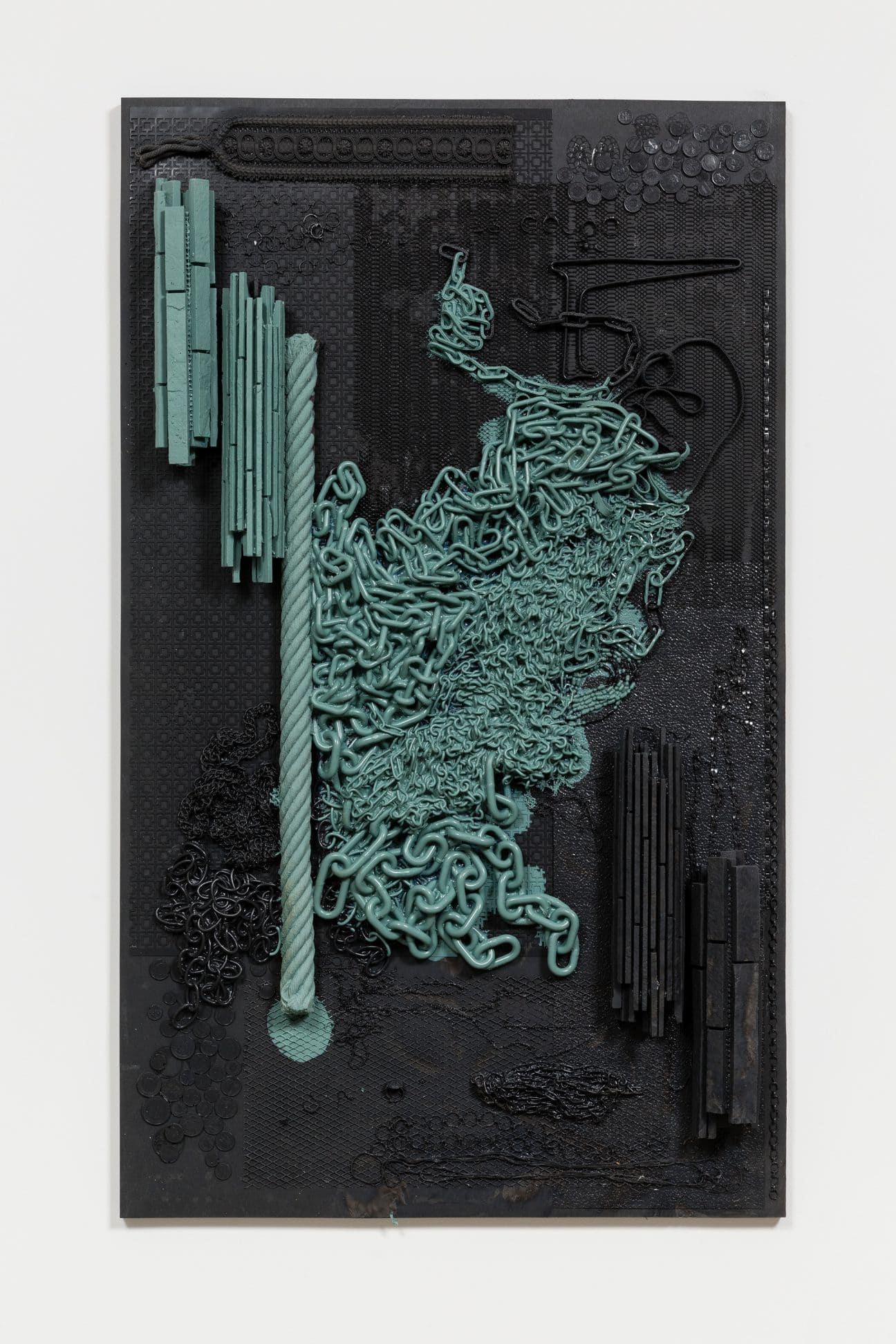Adjacent to the installation are examples from a series of solid rubber wall-based castings that recall the chaotic structures of 16th and 17th century Mannerist grotto design. The work presents the homogenized mechanical reproduction of individual objects: rope, jewelry, fabric, currency, stone, and chains, each of which maintain its original formal texture amidst its loss of functional status. The work is rendered through a single casting process during which color is added at the point when the material is still fluid.