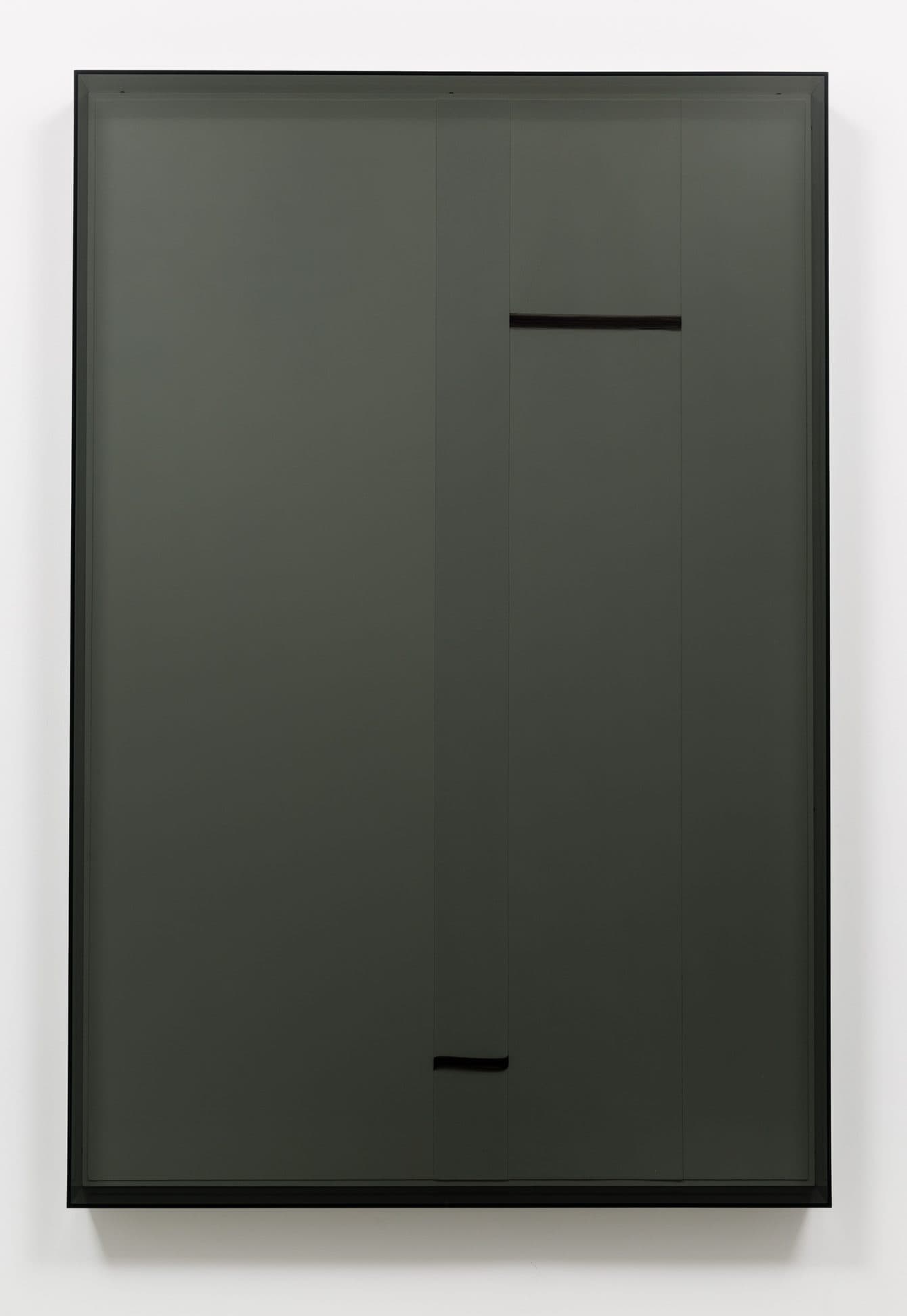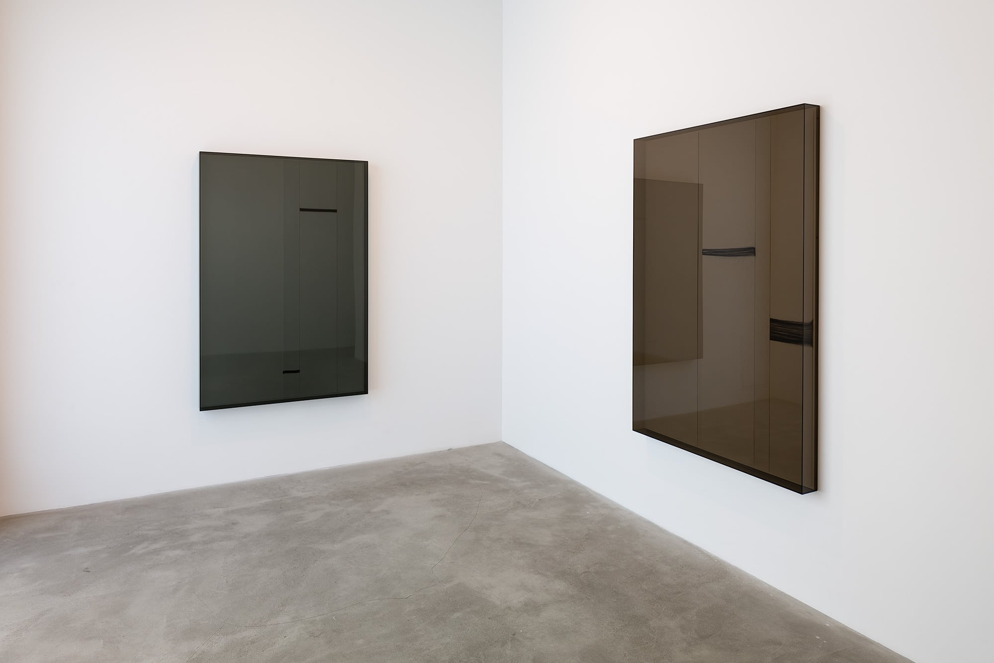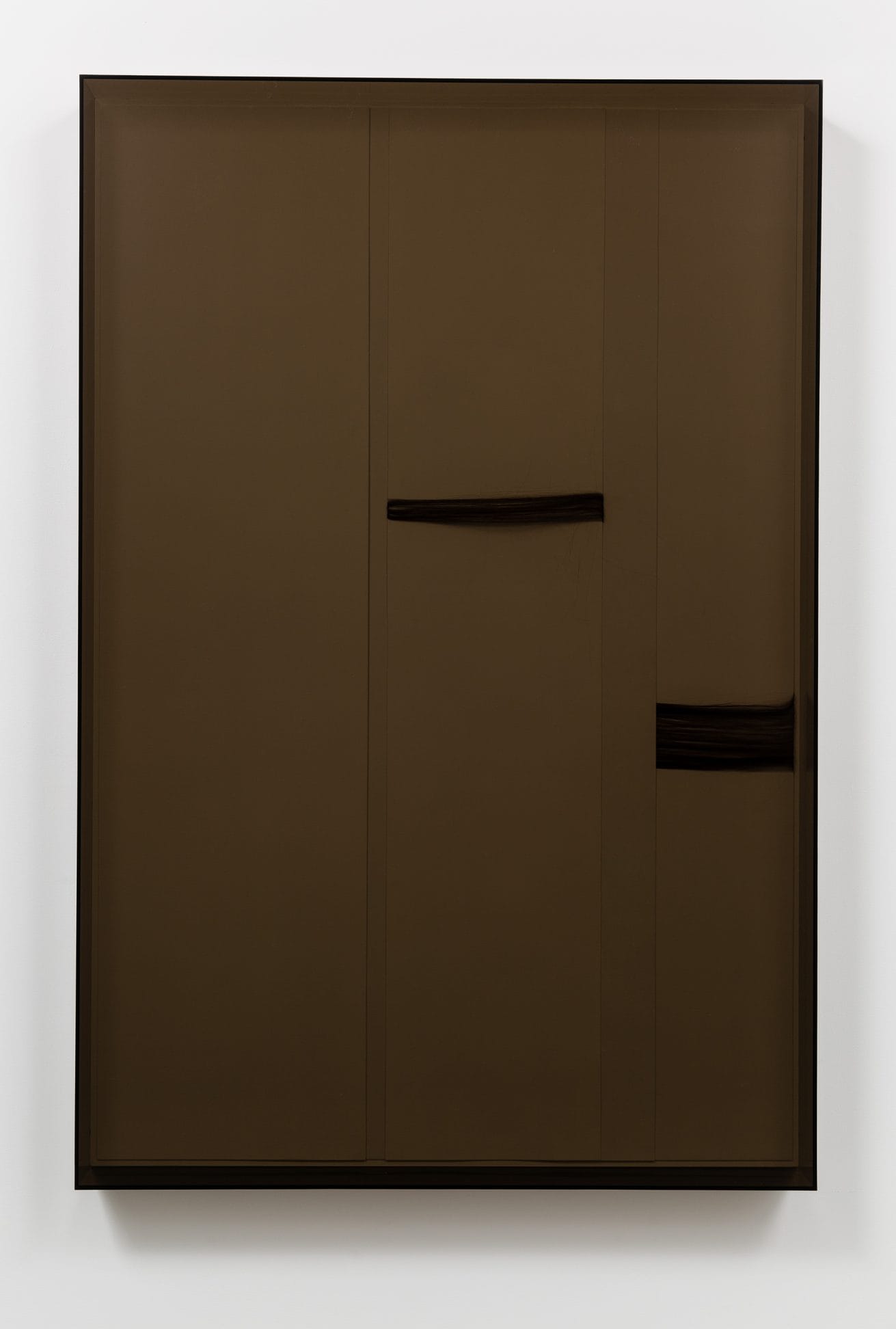 A different group of works, designated by the artist as “drawings,” features bands of human hair intertwined around thin strips of painted board, whose organization stems from the tradition of landscape composition. In this construct, our experience of the material changes as its formal fragility finds a dependency upon the geometric composition that supports it. Unlike the modified process of the castings, the strands of hair are unaltered, allowing for a corporeal experience to surface from the abstract system in which it has been inserted.