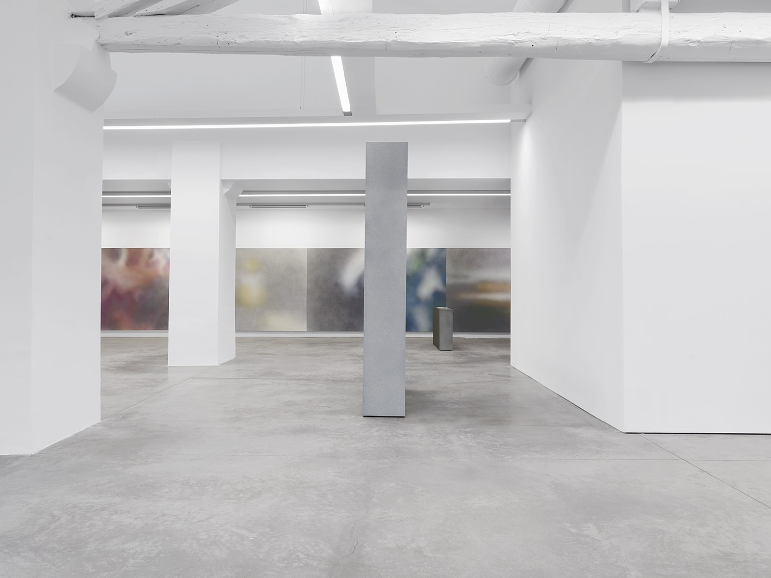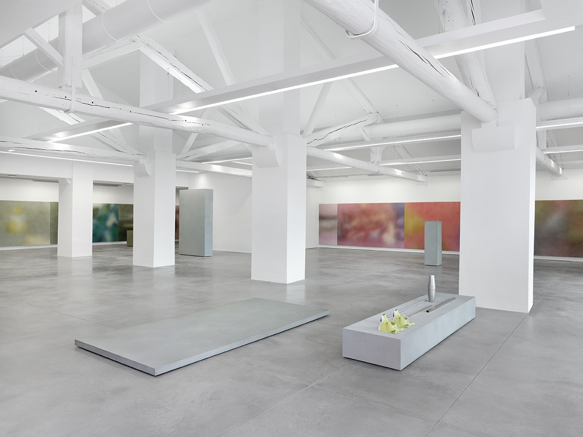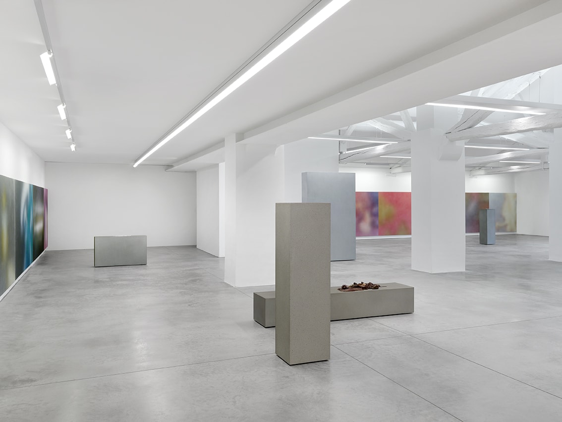 A l’étage, Isabelle Cornaro propose une série de peintures qui sont à la fois des reproductions et des agrandissements d’images de ses films. Dans ces peintures en spray, réalisées en projetant les pigments à même le support, l’artiste déconstruit l’image animée pour produire une série d’images fixes. Par opposition à la couleur digitale générée par les films, ces oeuvres sont des projections matérielles de couleur, créant un rendu sensible qui leur confère une séduction immédiate, un effet perceptif à la troublante beauté. Conservant les proportions 16/9 de l’image filmique, les peintures en spray sont installées bord à bord, reproduisant visuellement le défilement des images d’un banc de montage vidéo. Le spray crée un flou, une absence de focus qui décompose et dévitalise l’image, qui la rend quasi abstraite, produisant par la même un parallèle tant avec le pointillisme cher aux impressionnistes qu’avec la pixellisation des images numériques. Cette indétermination entre un objet et sa reproduction en image est redoublée par une série de monolithes énigmatiques présentés en vis-à-vis. Recouverts également de peintures en spray, ils créent dans l’espace une oscillation tout autant rétinienne que conceptuelle.