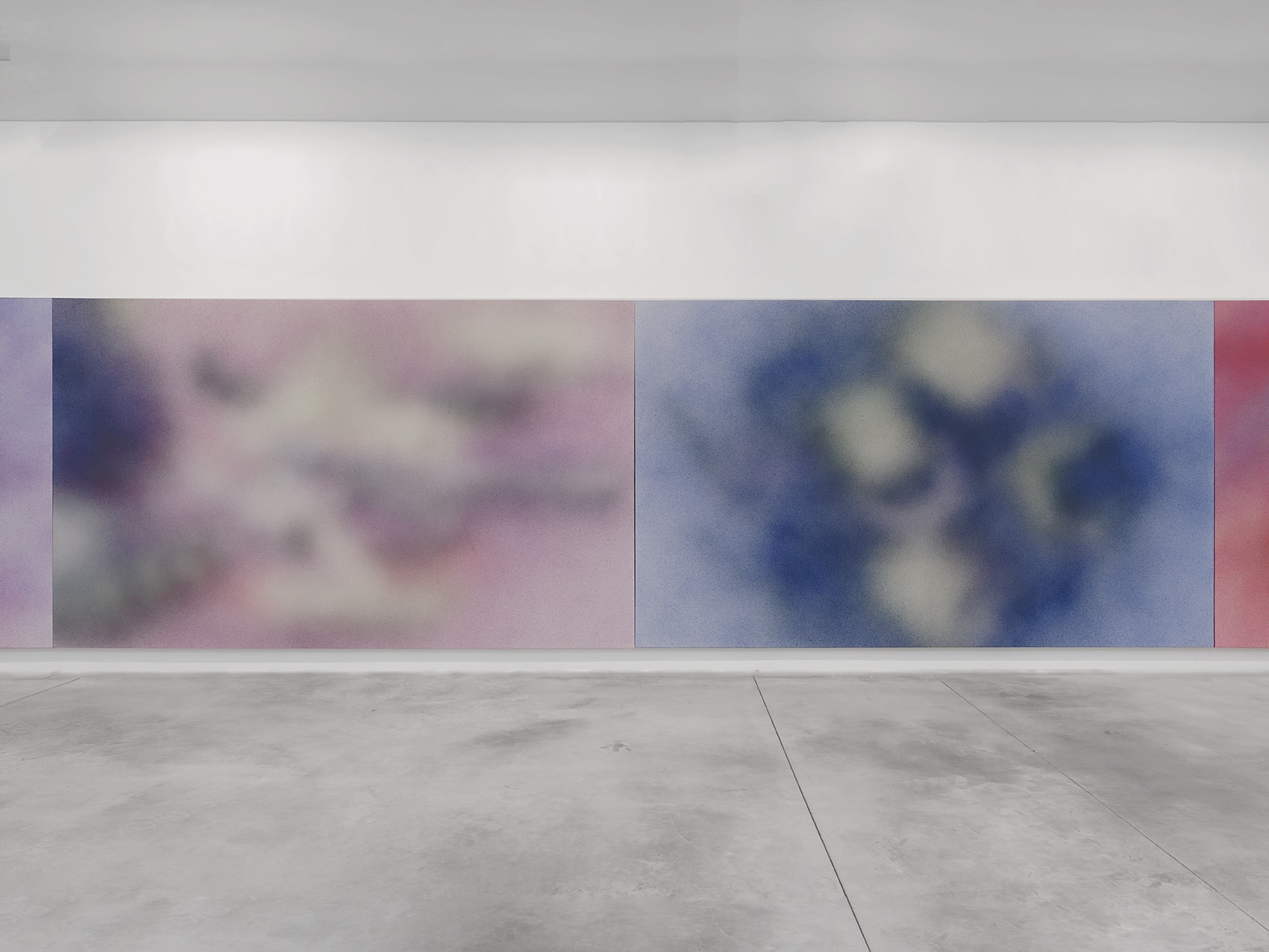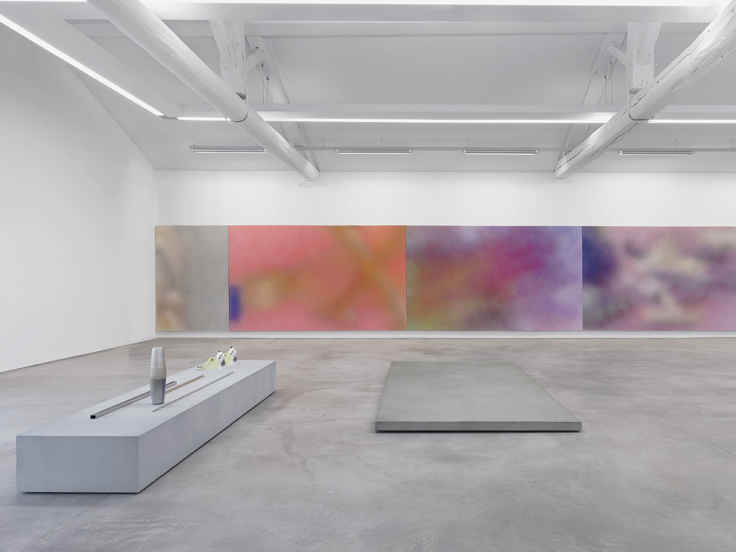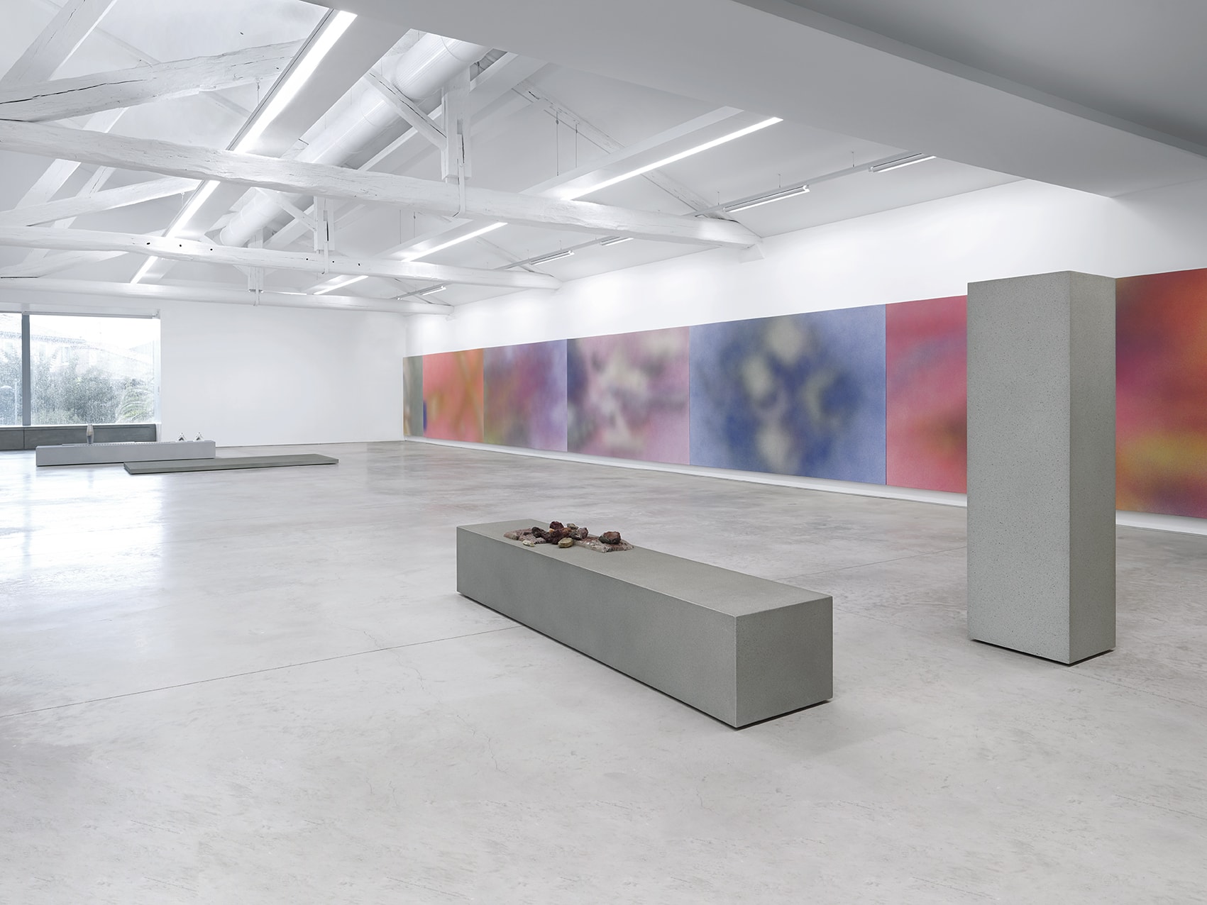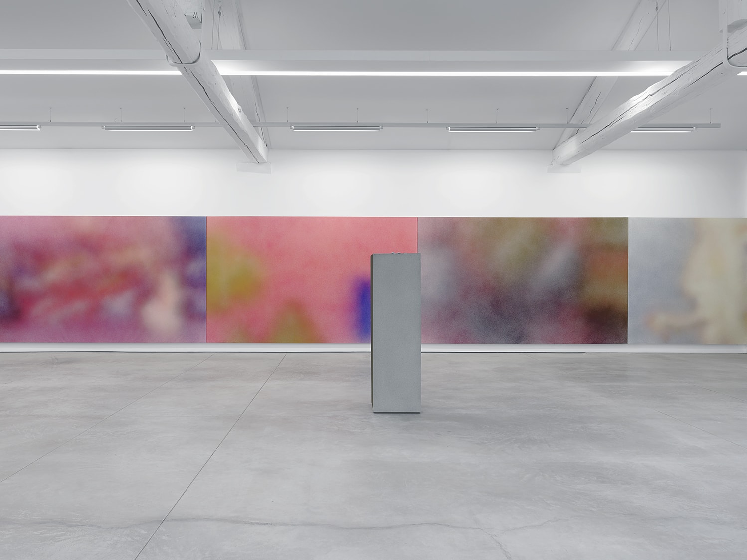 On the upper floor, Isabelle Cornaro presents a series of paintings — both reproductions and enlargements of images taken from her films. In these spray paintings, made by projecting pigments onto the surface of the film, the artist deconstructs the animated image to produce a series of stills. In contrast with the digital colour generated by the films, these works are material projections of colour, creating a sensitive rendering which endows them with an immediate seductive appeal, a perceptual effect of disturbing beauty. Keeping the 16/9 aspect ratio of the film image, the spray paintings are displayed side-by-side, and arranged edge-to-edge, visually reproducing the scrolling images of a video editing system. The spray creates fuzziness, an absence of focus that dissolves and numbs the image, making it almost abstract, producing parallels with both the pointillism cherished by the impressionists and the pixelisation of digital images. This ambiguity between an object and its reproduction as an image is intensified by a series of enigmatic monoliths displayed face-to-face. Also covered with spray paint, they create a spatial oscillation that is just as much retinal as it is conceptual.
