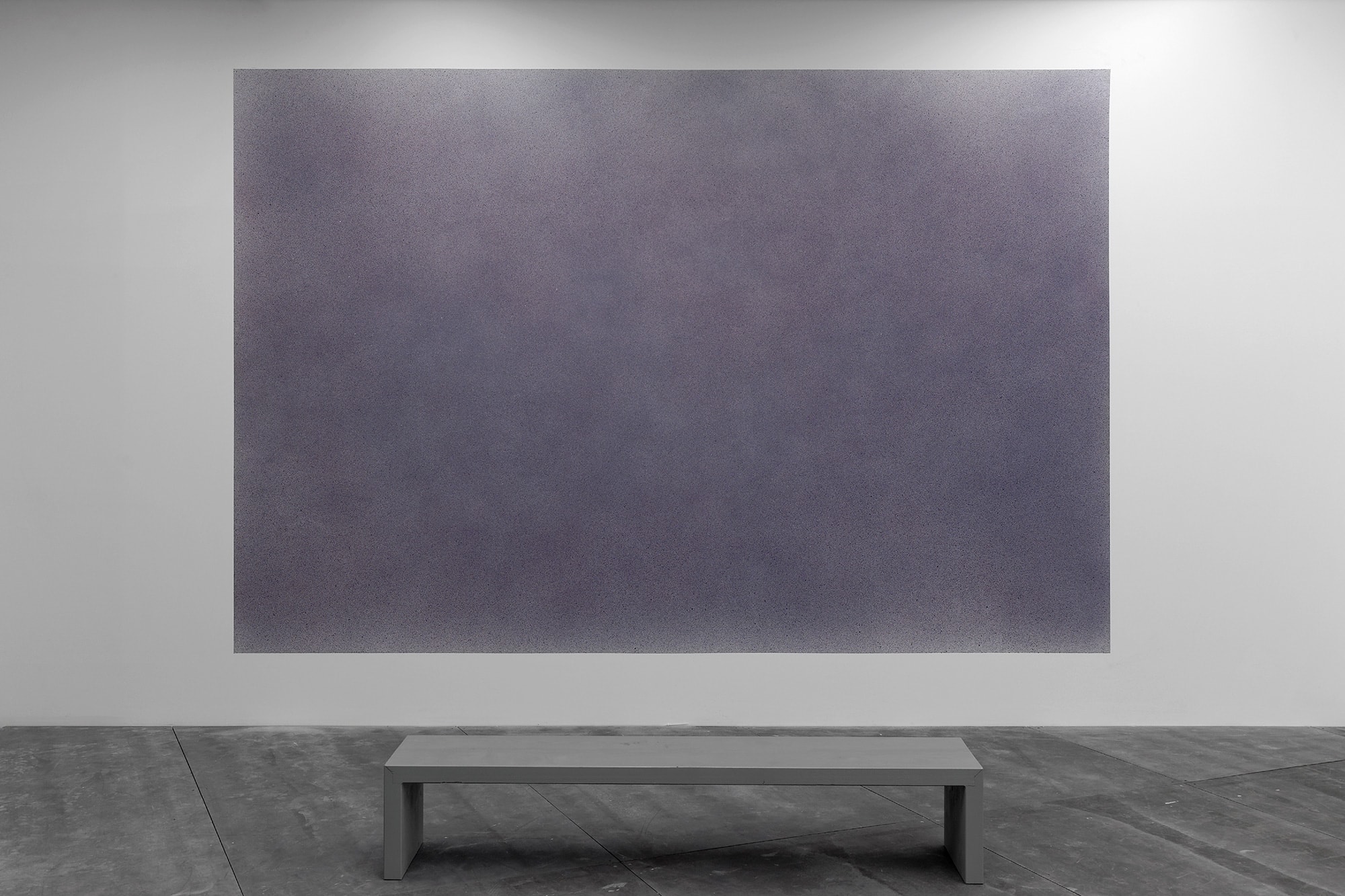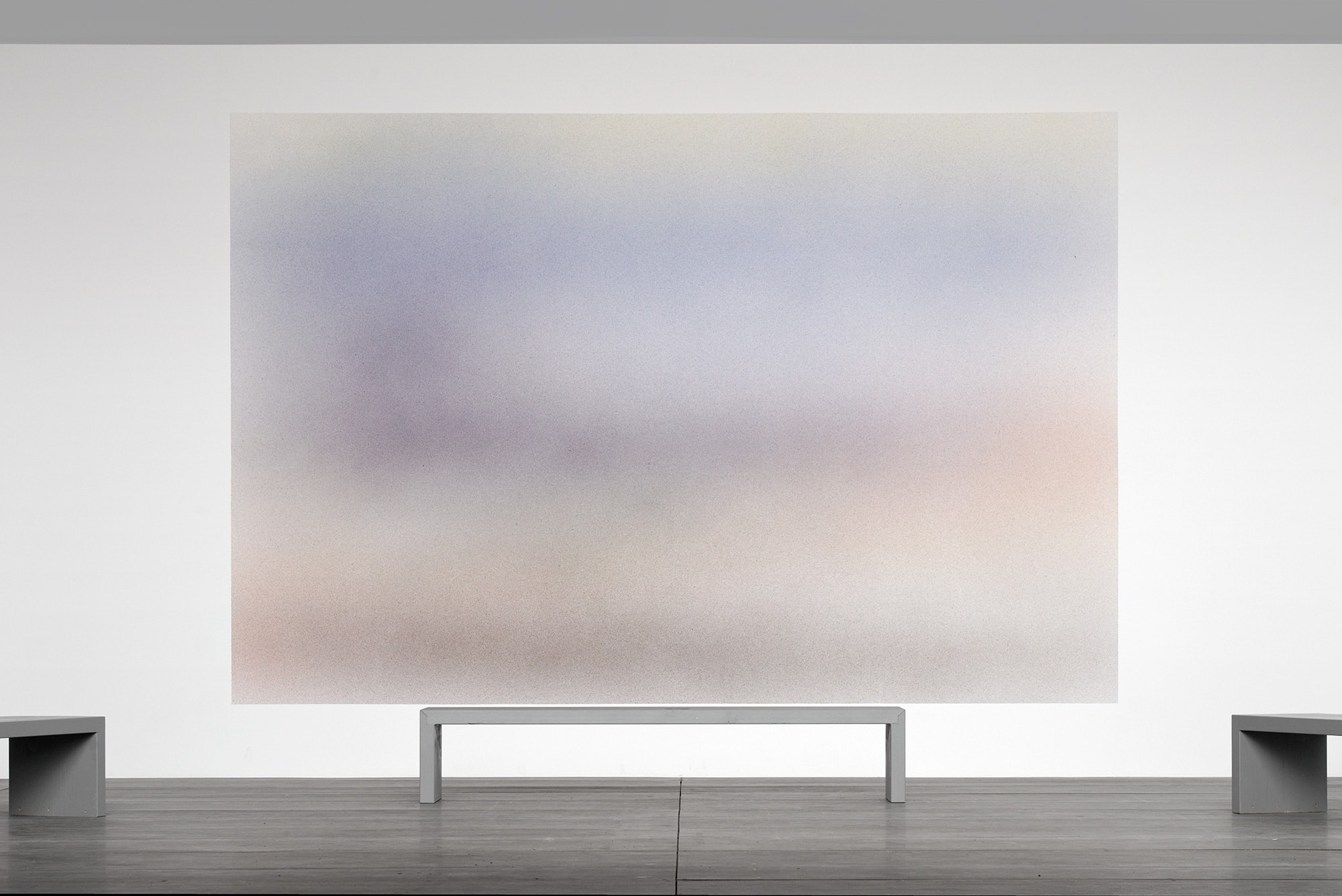 The artist has chosen to show monochromes (Reproductions #1, Reproductions #4) and landscapes (Reproductions #7) together at the Palais de Tokyo. The paintings are made using spray paint which gives them a textured finish. Their proportions are identical to those of a cinema projection, which reinforces their relation to perception.