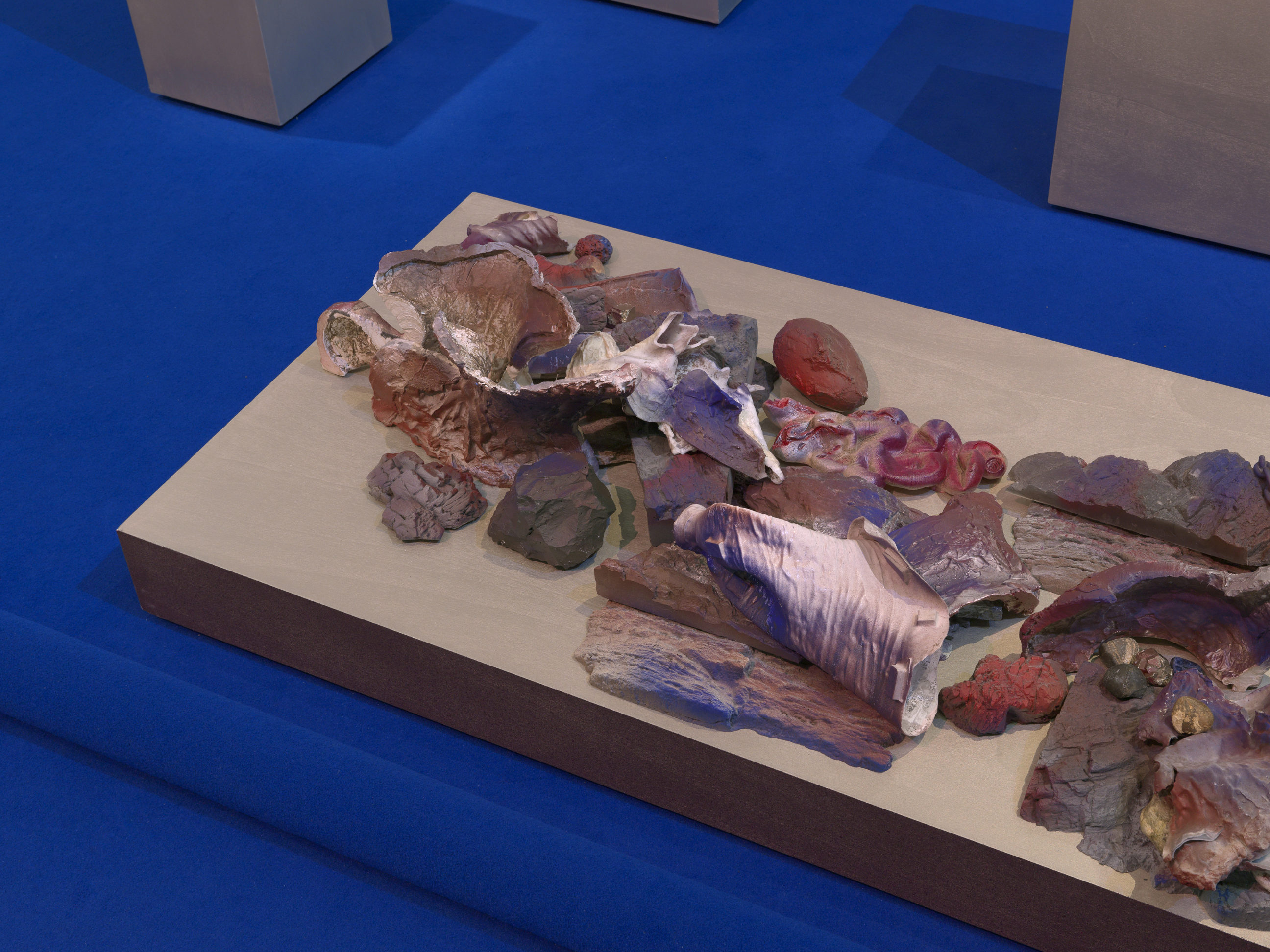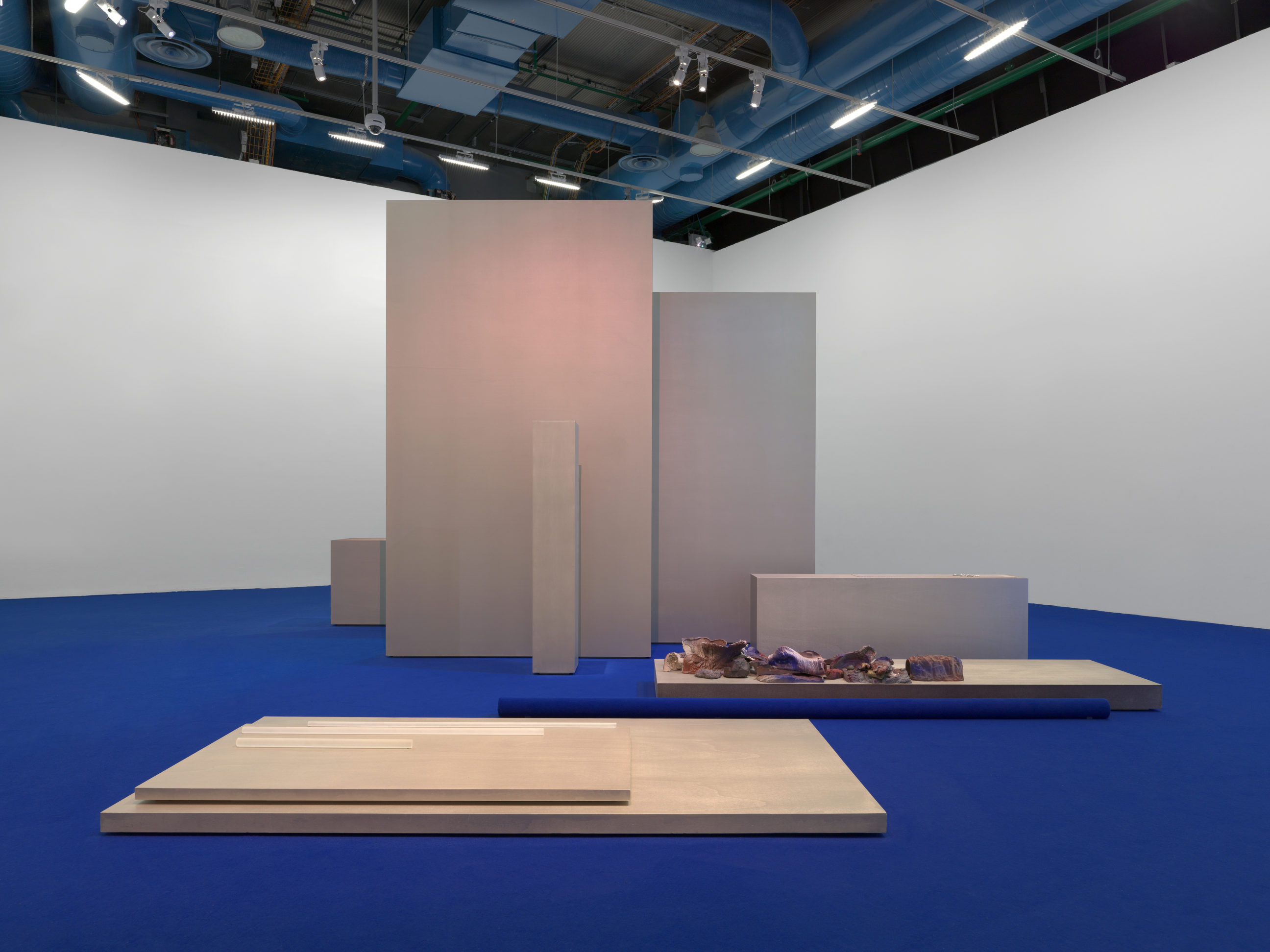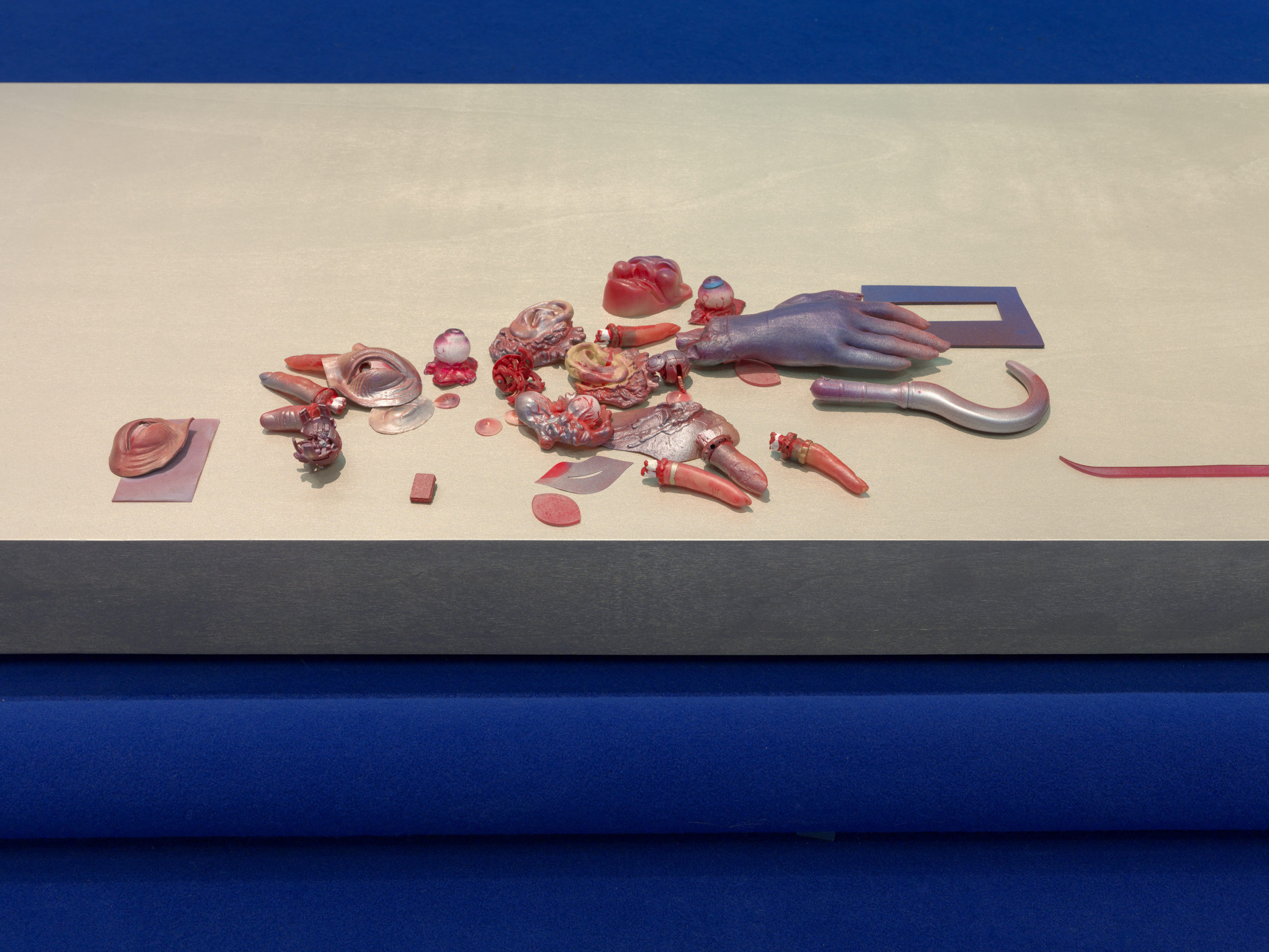 Objets standardisés liés à la production de masse et à l’industrie du divertissement (éléments de décors, accessoires, etc.), les objets qui la constituent apparaissent autant comme signes et symboles que formes à part entière, faisant se côtoyer le faux, le fragmentaire et le grotesque.