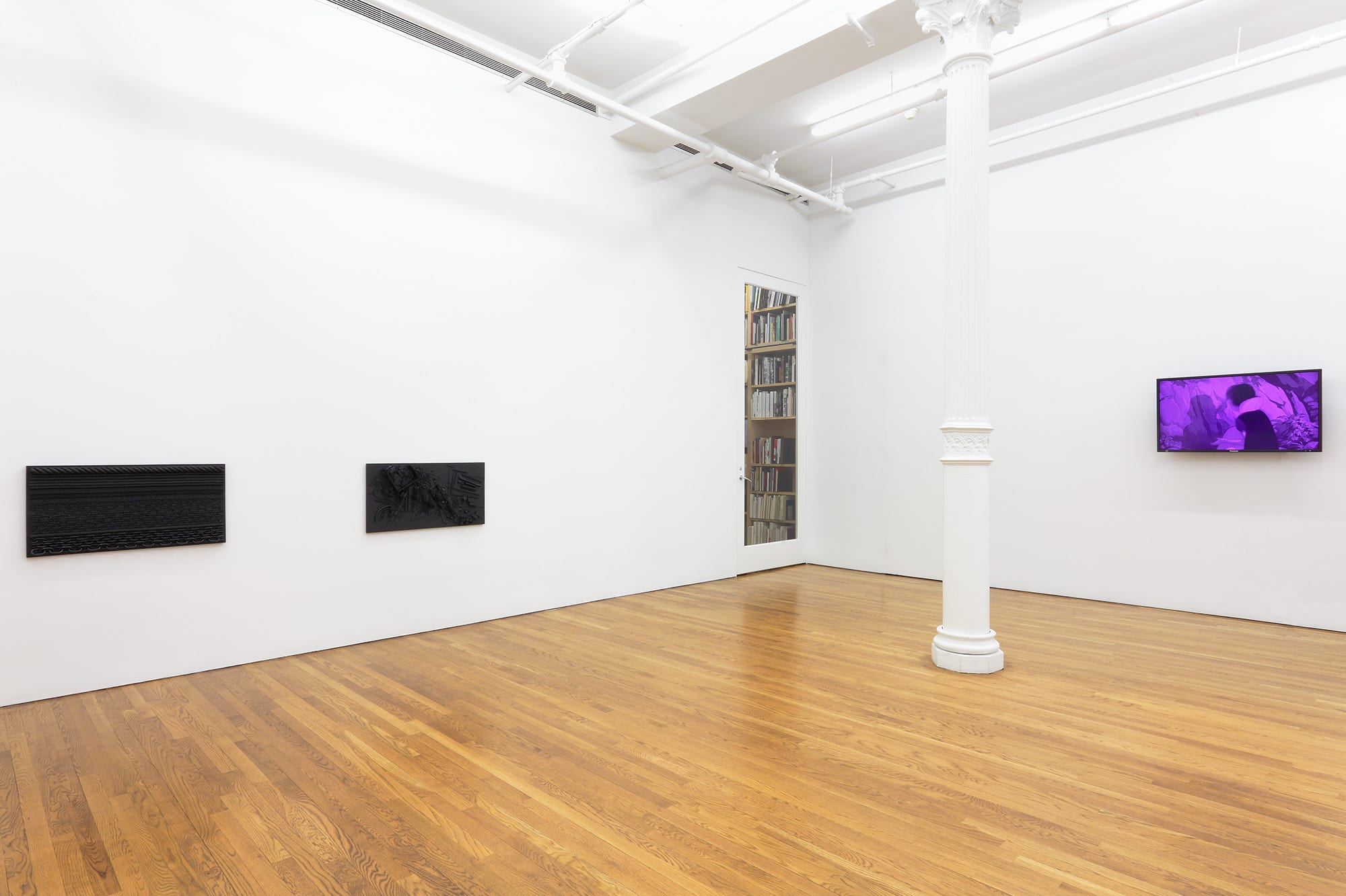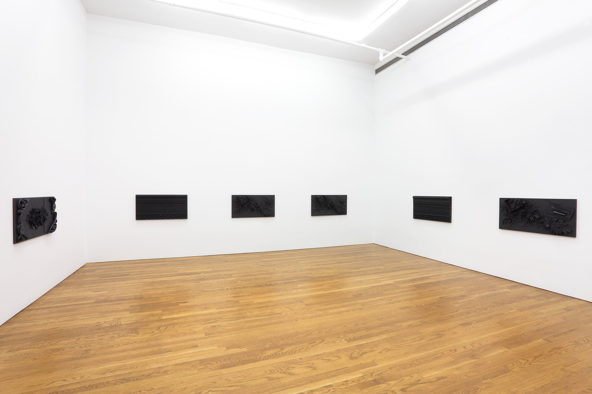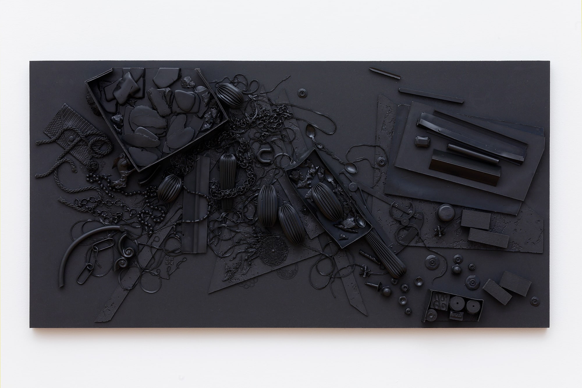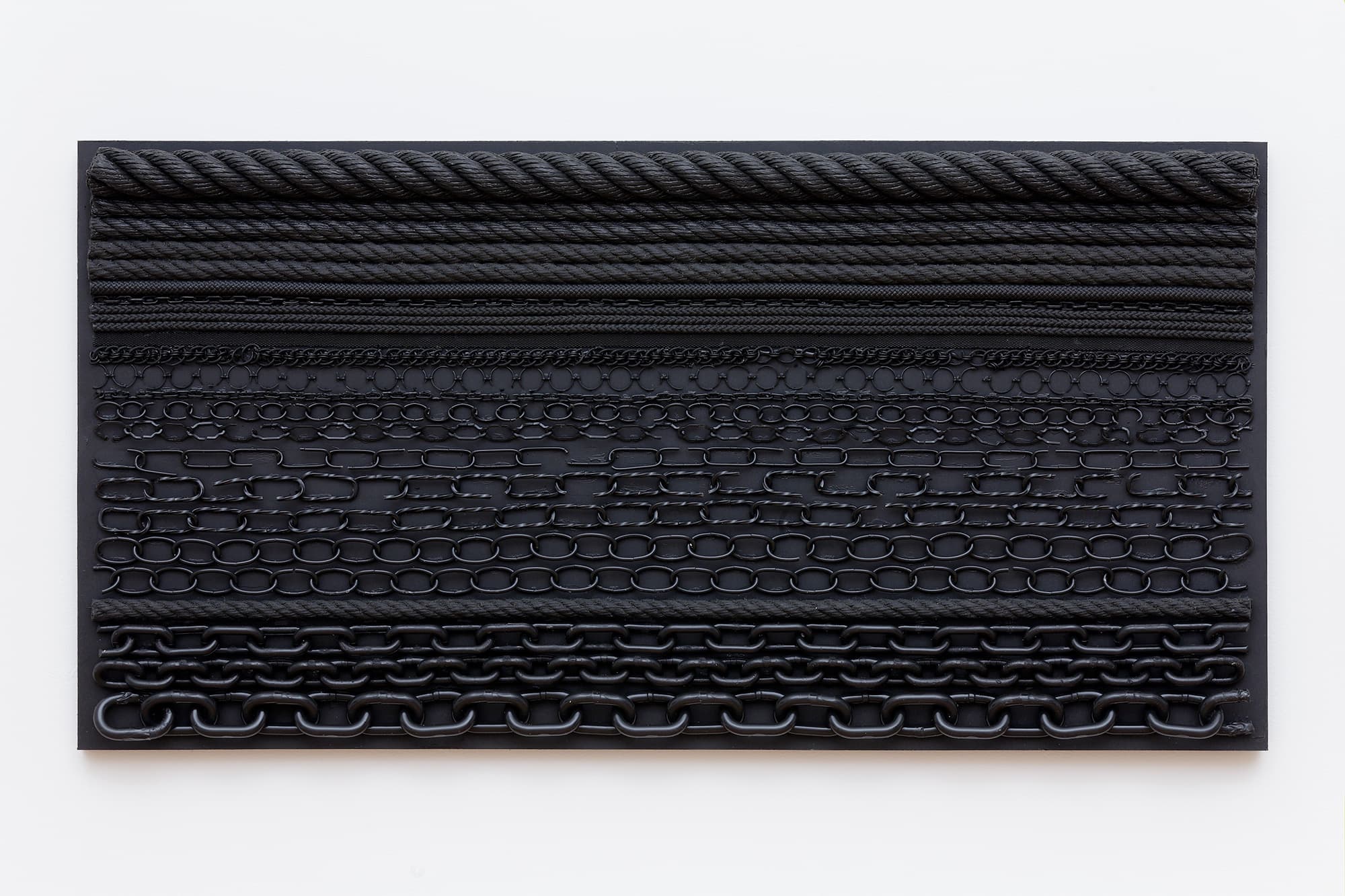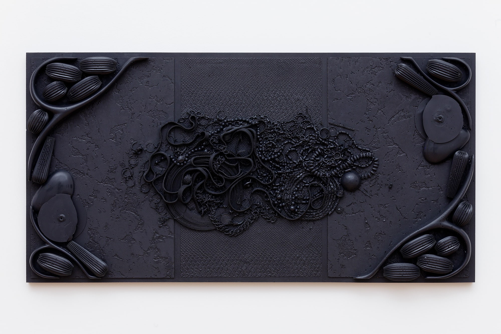 Presented on one horizontal line, the Orgon Door casts (2013) derive from the Kienholz-inspired God Boxes series Isabelle Cornaro began in 2013. Organized according to three principles: symmetry, entropy, and free association, objects of use and transaction are frozen in Elastomer, becoming decorative patterns and ambiguous landscapes. Ambiguity – the dark side of equivalence – hovers on the horizon toward which Isabelle Cornaro is constantly heading. She has said, “I find it difficult to work with pop culture because, in my opinion, it is already overflowing with meaning. Most importantly, pop tends to generate a positive, sentimental relationship to culture that I find unproductive. I prefer working with objects that make me ill at ease. This unsympathetic relationship to my source material creates a tension that I much prefer.”