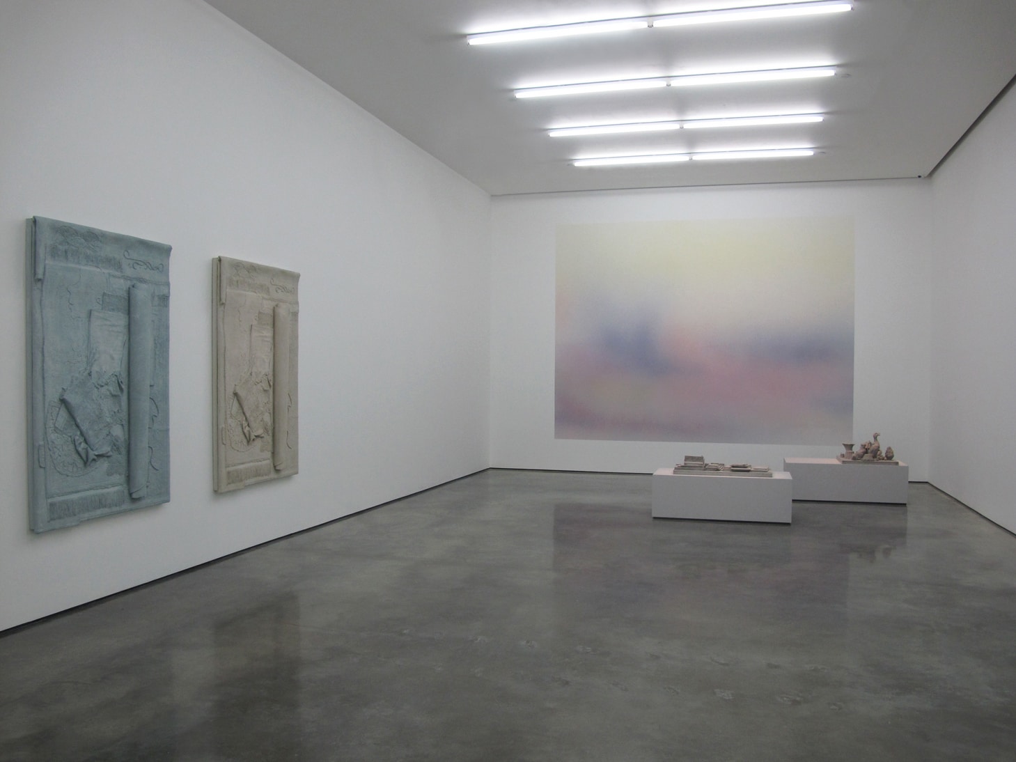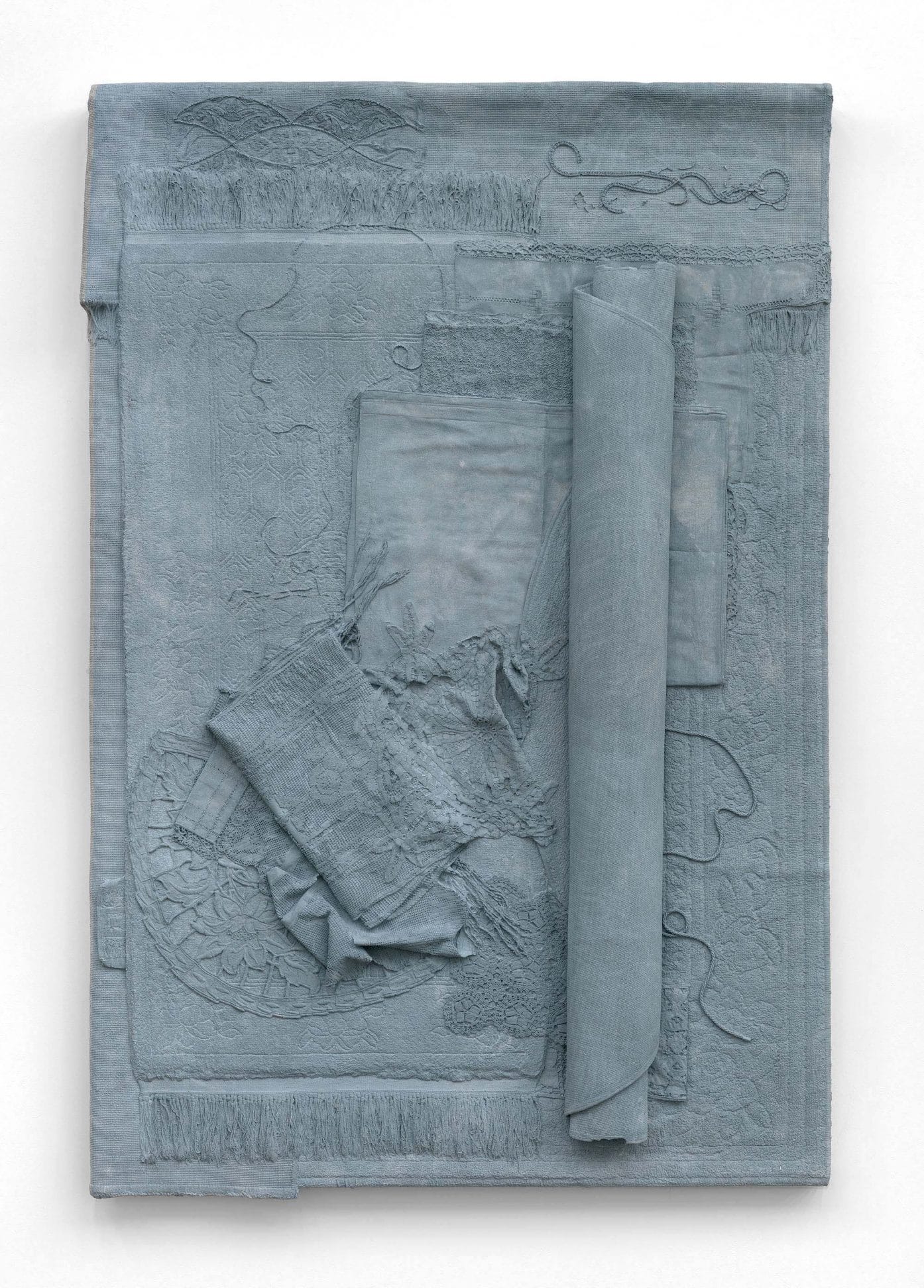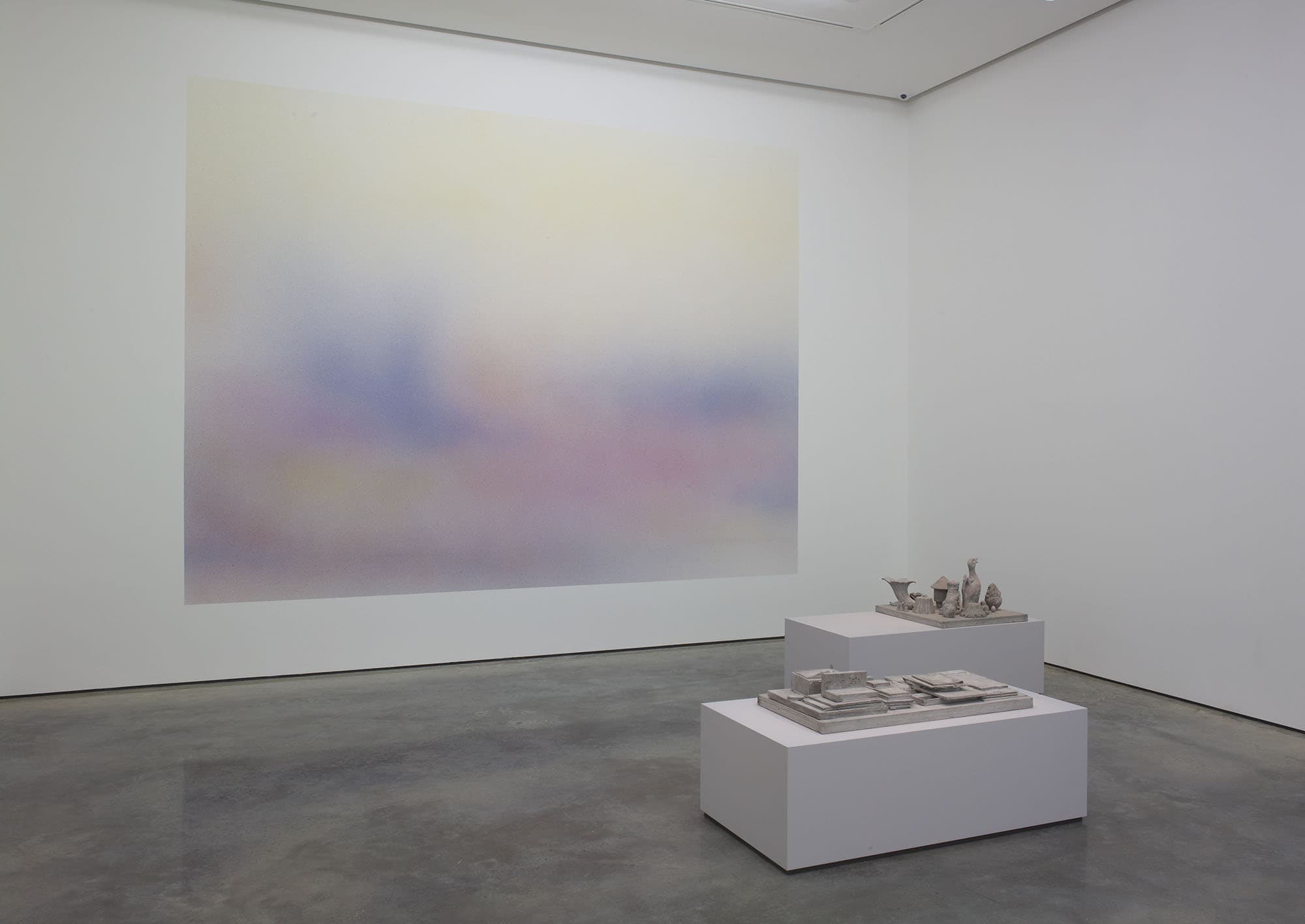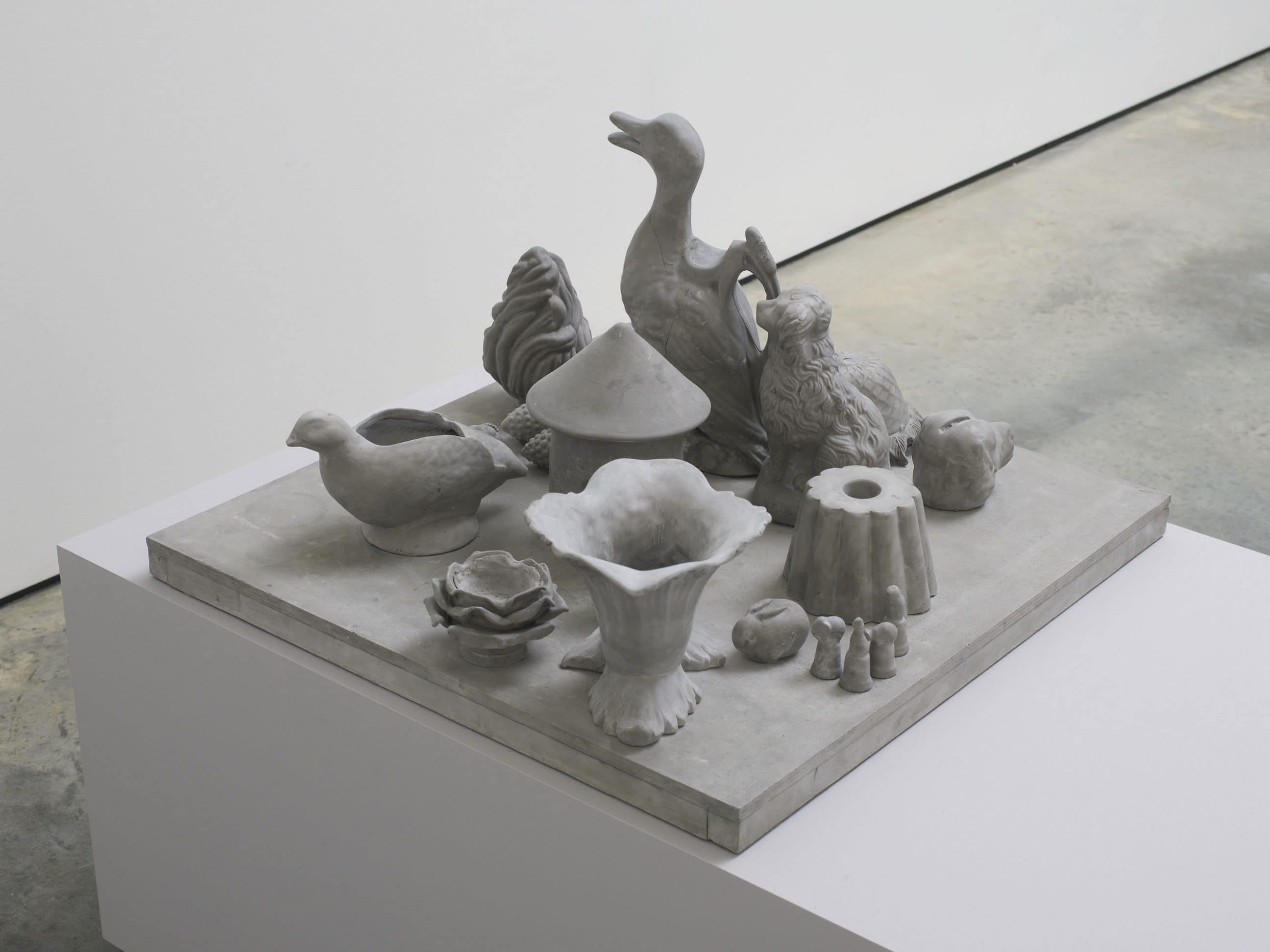 Through meticulous arrangements, she investigates the properties of objects and the historicity they can point to or steer away from. Homonyms (II) (2012), for example, are coloured plaster casts taken from soft materials such as laces, quilts and carpets. The misplaced use of colour and materiality of their new form alters their original identity and disrupts how these transformed objects are perceived. In the film, Money filmed from the side and a three-quarter view (2010), Cornraro portrays actual coins and Euro notes being transformed into abstract forms through the cinematic use of light and colour. The preoccupation with spatiality and light in the film brings currency’s aesthetic into the composition, stripping the importance of its monetary value. Cornaro creates differing landscapes in her work, welcoming new reflections on the ideology of object and space.